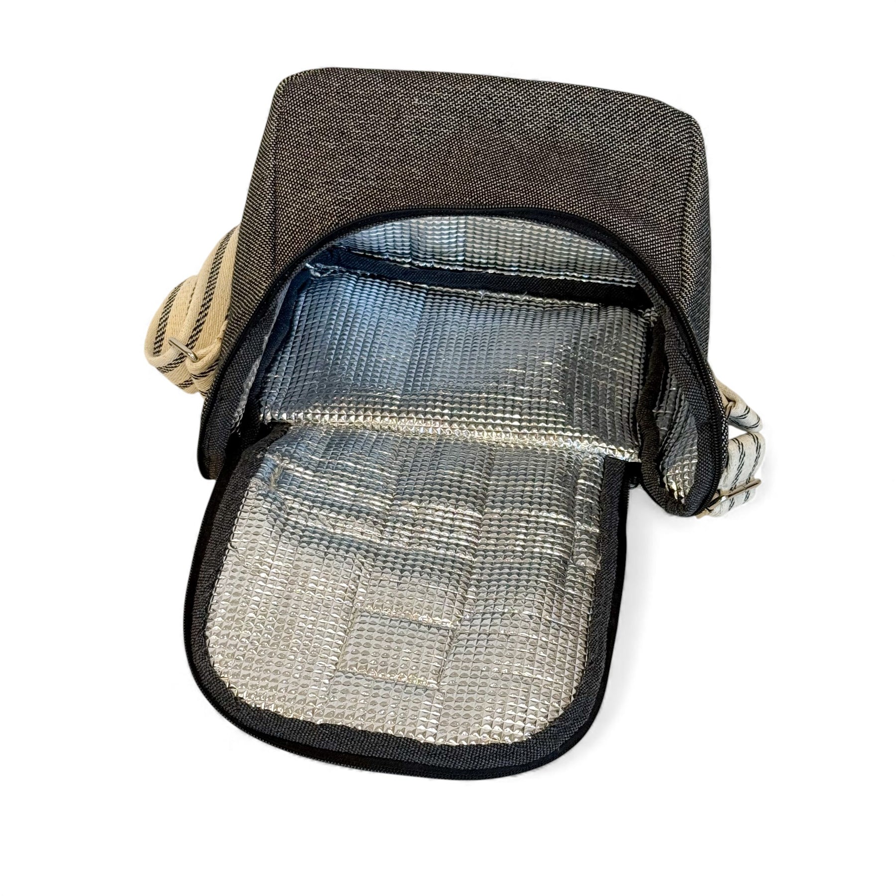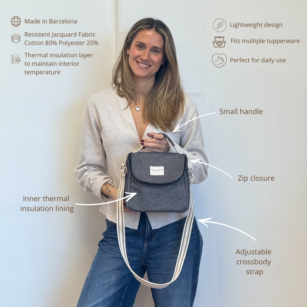 Bolso porta alimentos. Con un tejido grueso de jacquard 80% algodón y 20% poliéster de color negro/gris oscuro en el exterior y capa de material térmico aislante para mantener temperatura en el interior. Con asa para llevar en la mano y asa de cinta de algodón de color crudo con lineas negras en los laterales, regulable para llevar cruzado. Para su correcto mantenimiento se aconseja lavarlo en frío y no utilizar secadora.