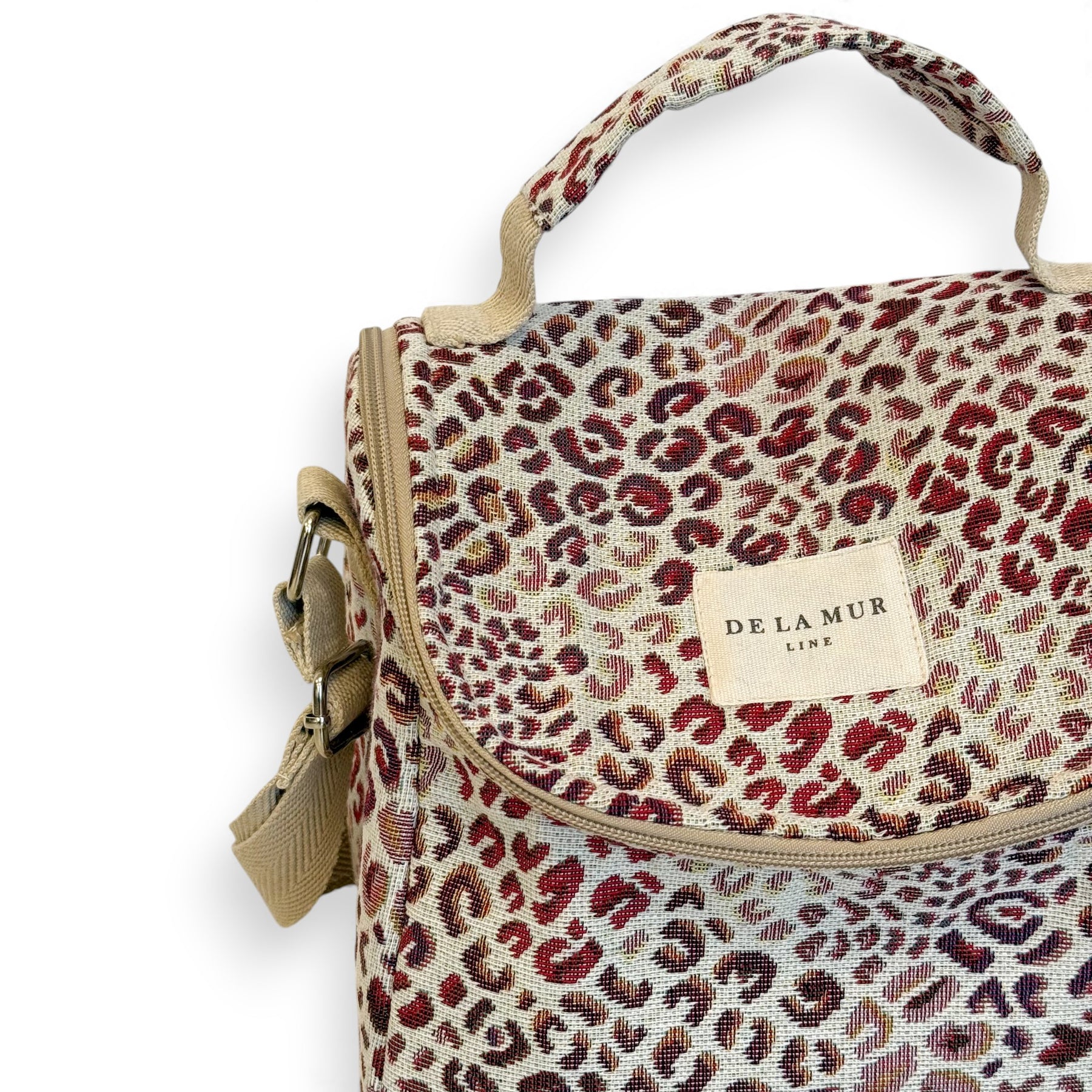 Bolso porta alimentos. Con un tejido grueso de jacquard 80% algodón y 20% poliéster con estampado de leopardo en tonos rosados y lilas en el exterior y capa de material térmico aislante para mantener temperatura en el interior. Con asa para llevar en la mano y asa de cinta de algodón de color beige regulable para llevar cruzado. Para su correcto mantenimiento se aconseja lavarlo en frío y no utilizar secadora.