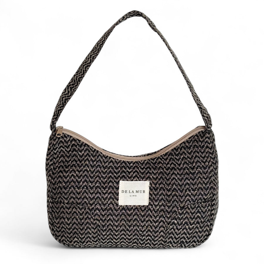 Bolso pequeño para llevar al hombro con asa de tejido. Cierre superior con cremallera. Con tejido grueso de jacquard con estampado de zigzag de color negro y beige. Forrado de tejido grueso de color gris en la parte interior. Bolsillo interior con cremallera. Para su correcto mantenimiento se aconseja lavarlo en frío a mano y no utilizar secadora.