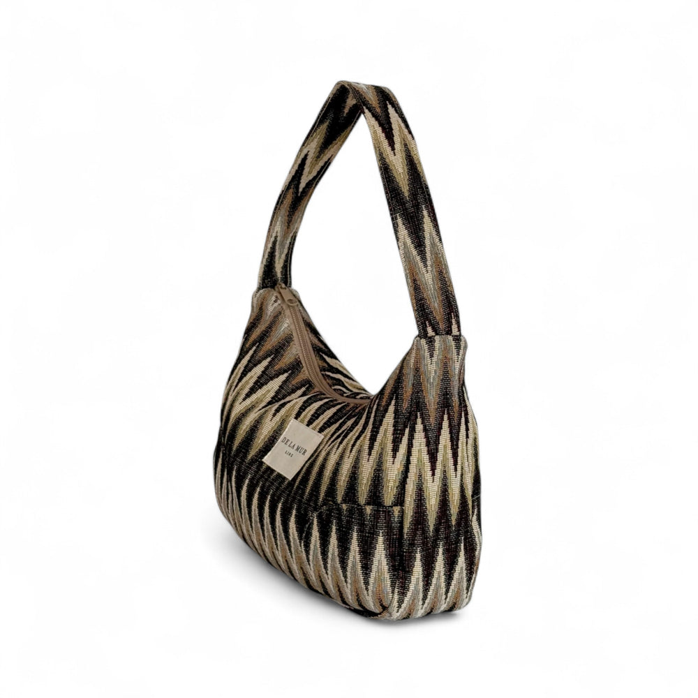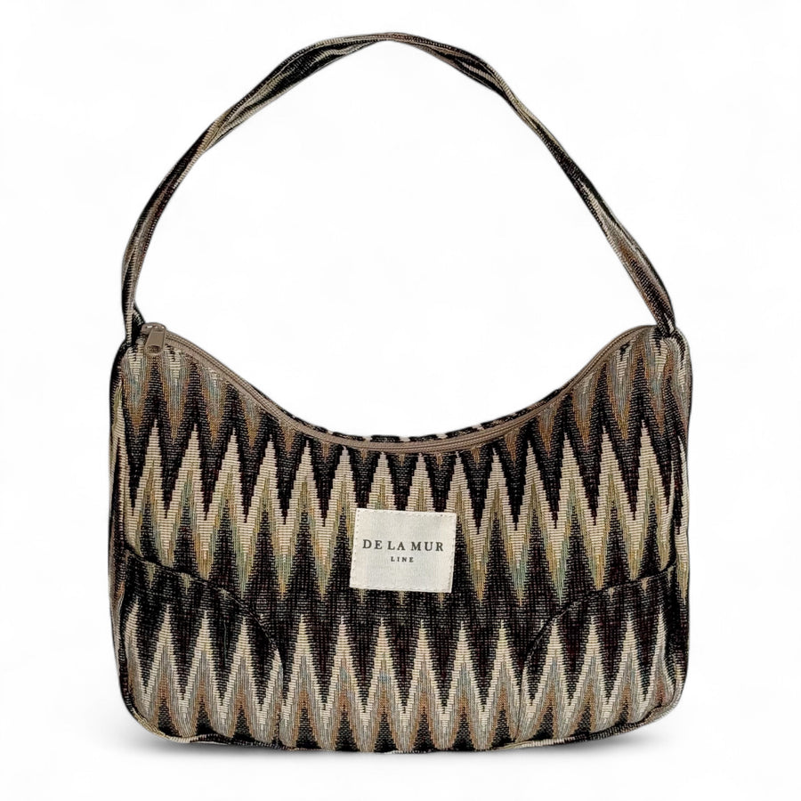 Bolso pequeño para llevar al hombro con asa de tejido. Cierre superior con cremallera. Con tejido grueso de jacquard con estampado de zigzag en tonos marrón y beige. Forrado de tejido grueso de color gris en la parte interior. Bolsillo interior con cremallera. Para su correcto mantenimiento se aconseja lavarlo en frío a mano y no utilizar secadora.