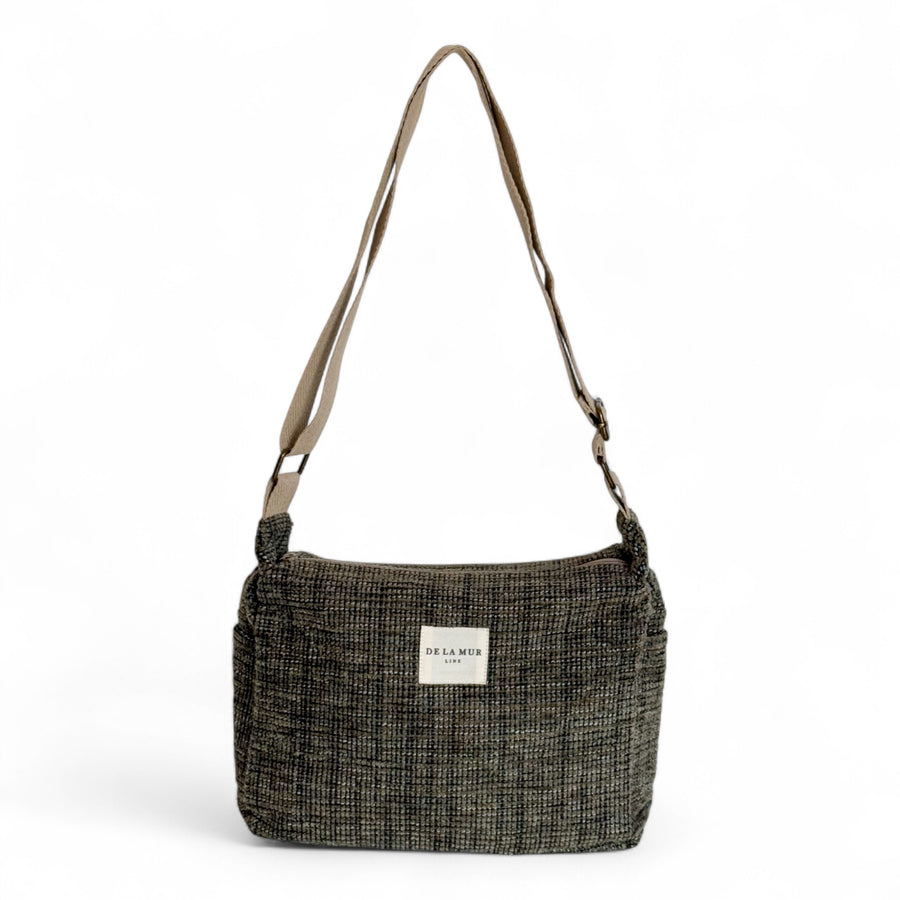 Bolso pequeño tipo bandolera con asa larga ajustable de cinta de espiga de algodón de color caqui con rayita discontinua de color negro. Cierre superior con cremallera. Bolsillos laterales sin cremallera. Con tejido grueso tapicero de color caqui. Forrado de tejido grueso de color gris en la parte interior. Bolsillo interior con cremallera. Para su correcto mantenimiento se aconseja lavarlo en frío a mano y no utilizar secadora.