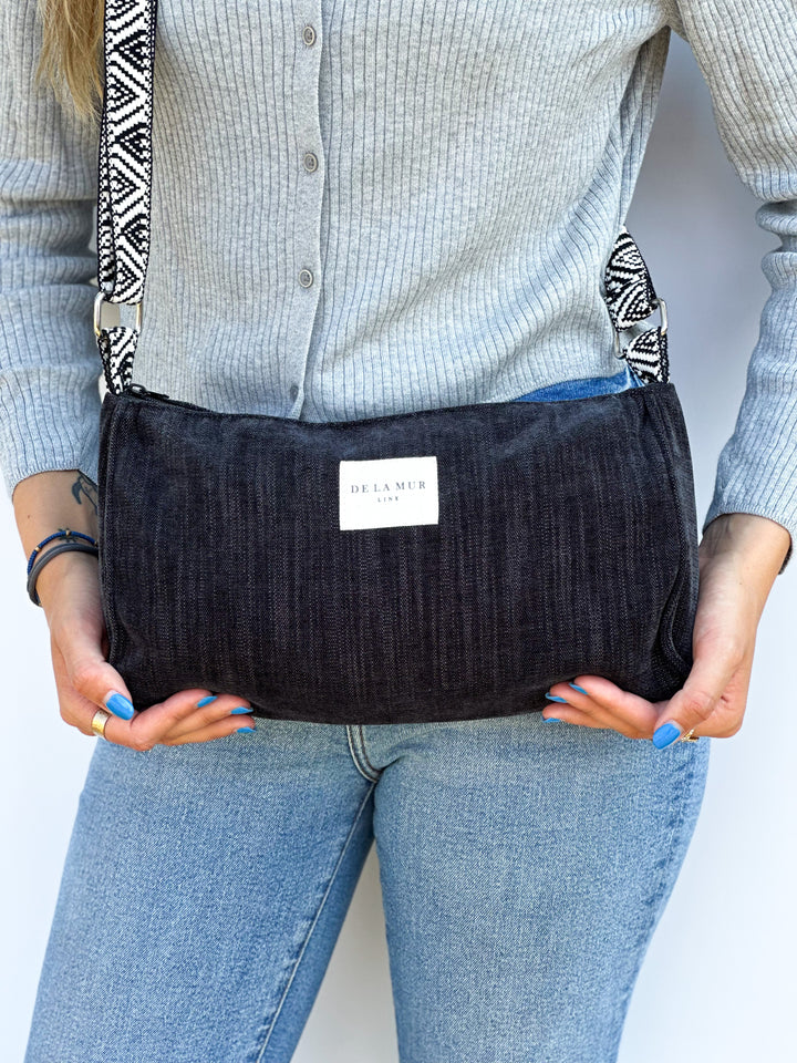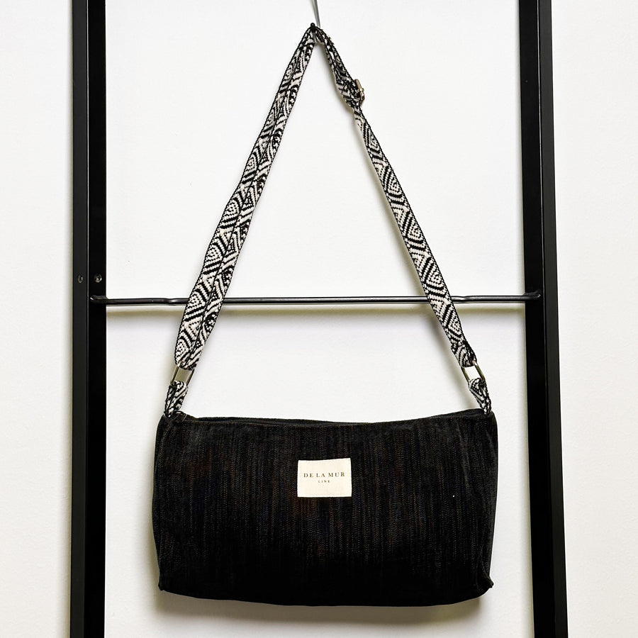 Bolso pequeño tipo bandolera con asa larga ajustable de cinta de espiga de algodón con estampado étnico blanco y negro. Con tejido grueso de terciopelo de color negro. Cierre superior con cremallera. Forrado de tejido grueso de color gris en la parte interior. Bolsillo interior con cremallera. Para su correcto mantenimiento se aconseja lavarlo en frío a mano y no utilizar secadora.