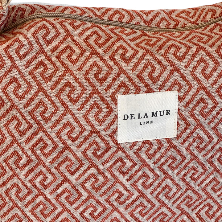Bolso pequeño tipo bandolera con asa larga ajustable de cinta de espiga de algodón de color beige. Cierre superior con cremallera. Bolsillos laterales sin cremallera. Con tejido grueso de jacquard con estampado geométrico en tono teja. Forrado de tejido grueso de color gris en la parte interior. Bolsillo interior con cremallera. Para su correcto mantenimiento se aconseja lavarlo en frío a mano y no utilizar secadora.
