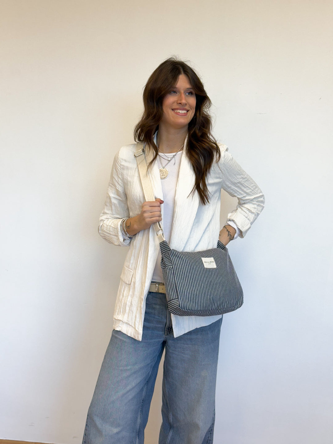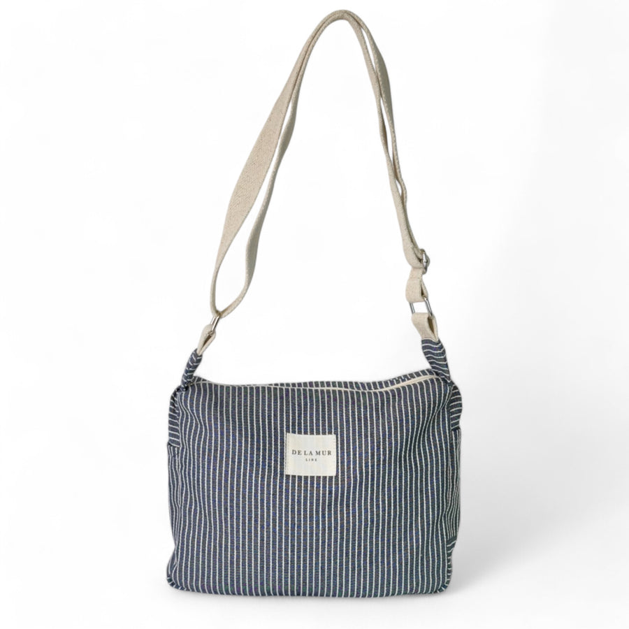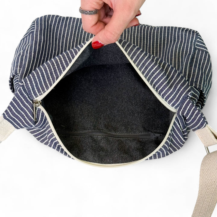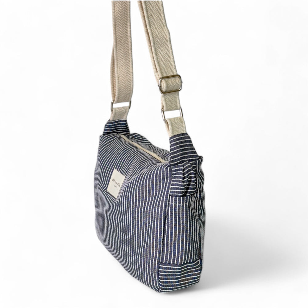 Bolso pequeño tipo bandolera con asa larga ajustable de cinta de espiga de algodón de color crudo. Cierre superior con cremallera. Bolsillos laterales sin cremallera. Con tejido fino a rayas de color crudo sobre fondo azul marino. Forrado de tejido grueso de color gris en la parte interior. Bolsillo interior con cremallera. Para su correcto mantenimiento se aconseja lavarlo en frío a mano y no utilizar secadora.