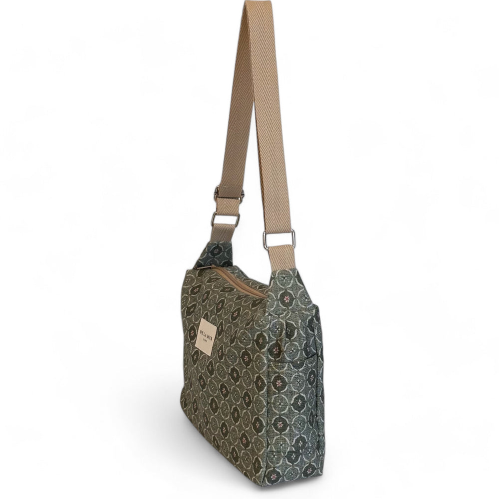 Bolso pequeño tipo bandolera con asa larga ajustable de cinta de espiga de algodón de color beige. Cierre superior con cremallera. Bolsillos laterales sin cremallera. Con tejido fino de half-panama con estampado geométrico de color verde. Forrado de tejido grueso de color gris en la parte interior. Bolsillo interior con cremallera. Para su correcto mantenimiento se aconseja lavarlo en frío a mano y no utilizar secadora.