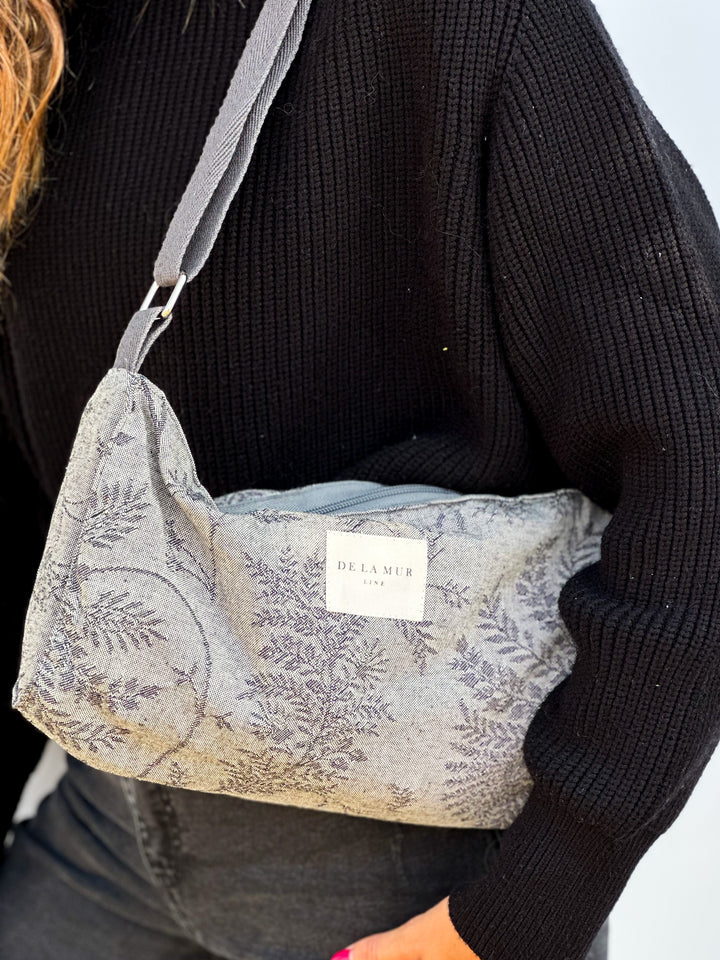 Bolso pequeño tipo bandolera con asa larga ajustable de cinta de espiga de algodón de color gris. Con tejido fino con estampado floral de color gris. Cierre superior con cremallera. Forrado de tejido grueso de color gris en la parte interior. Bolsillo interior con cremallera. Para su correcto mantenimiento se aconseja lavarlo en frío a mano y no utilizar secadora.