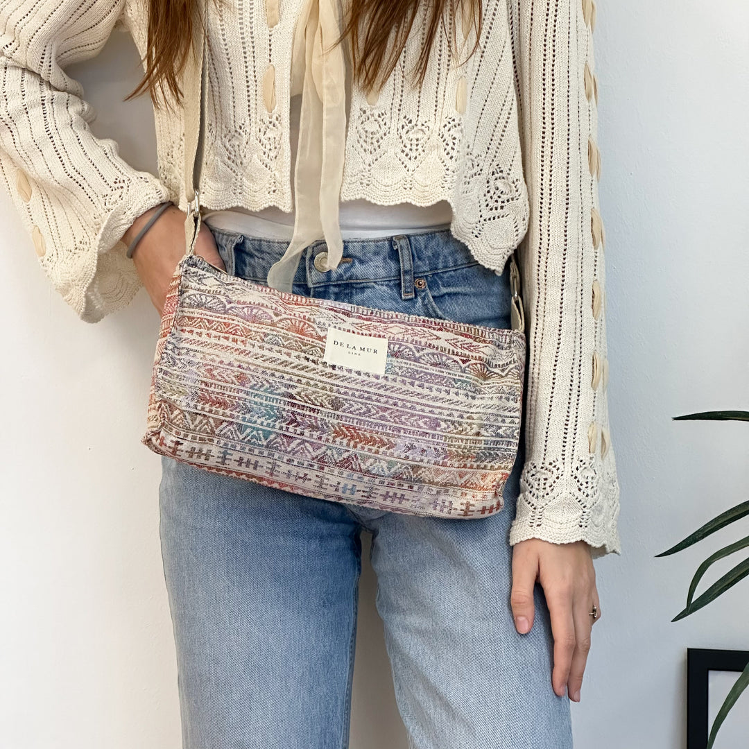 Bolso pequeño tipo bandolera con asa larga ajustable. Con un tejido de estampado étnico multicolor. Bolsillo interior con cremallera. Asa de cinta de espiga de algodón de color beige. Para su correcto mantenimiento se aconseja lavarlo en frío y no utilizar secadora.
