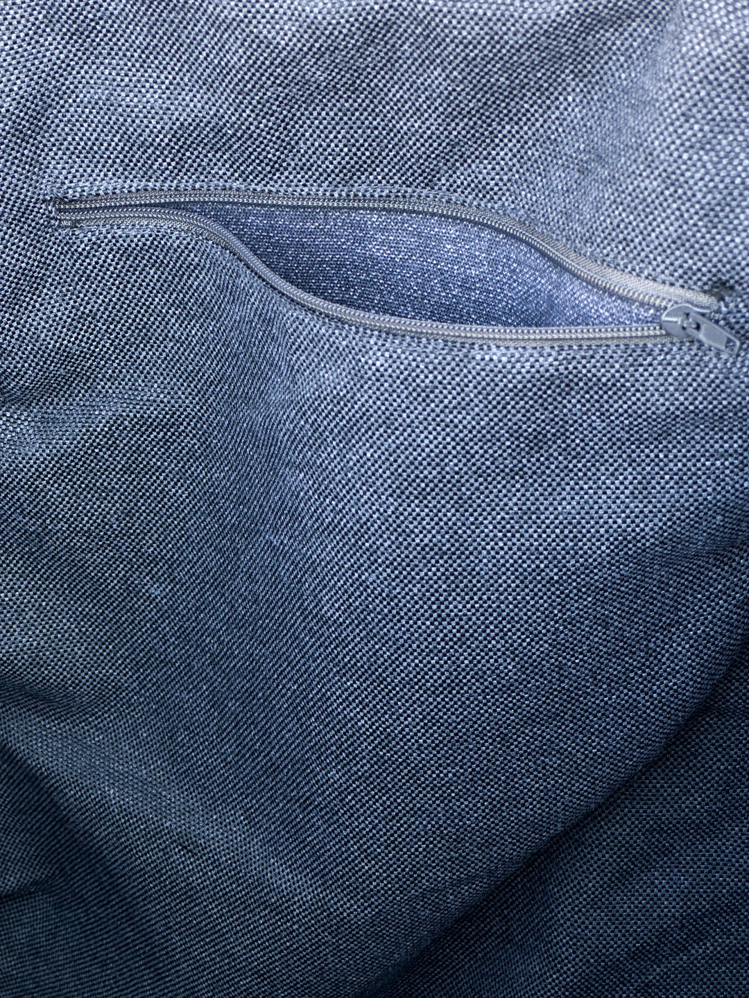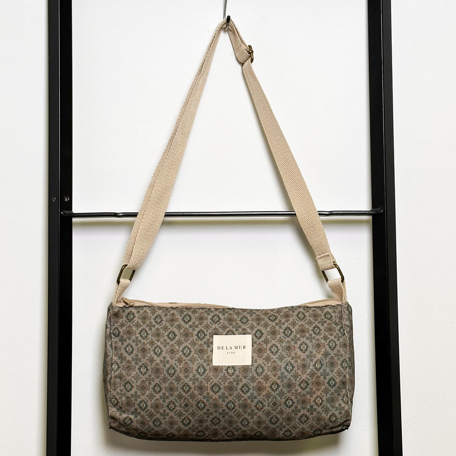 Bolso pequeño tipo bandolera con asa larga ajustable de cinta de espiga de algodón de color beige. Con tejido fino con estampado geométrico de color verde caqui. Cierre superior con cremallera. Forrado de tejido grueso de color gris en la parte interior. Bolsillo interior con cremallera. Para su correcto mantenimiento se aconseja lavarlo en frío a mano y no utilizar secadora.