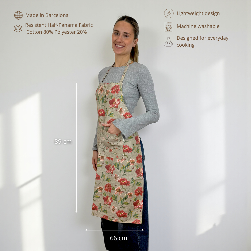 Delantal con bolsillo delantero, confeccionado en tejido fino de half-panama 80% algodón y 20% poliéster con estampado a floral rojo. El bolsillo en un tejido floral anaranjado, que aporta contraste y un toque especial que lo hace aún más único.
