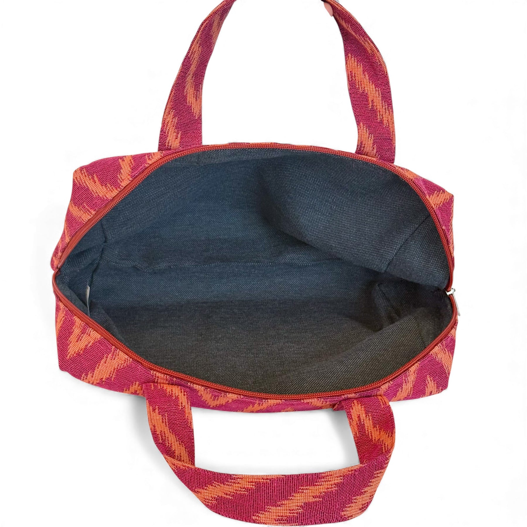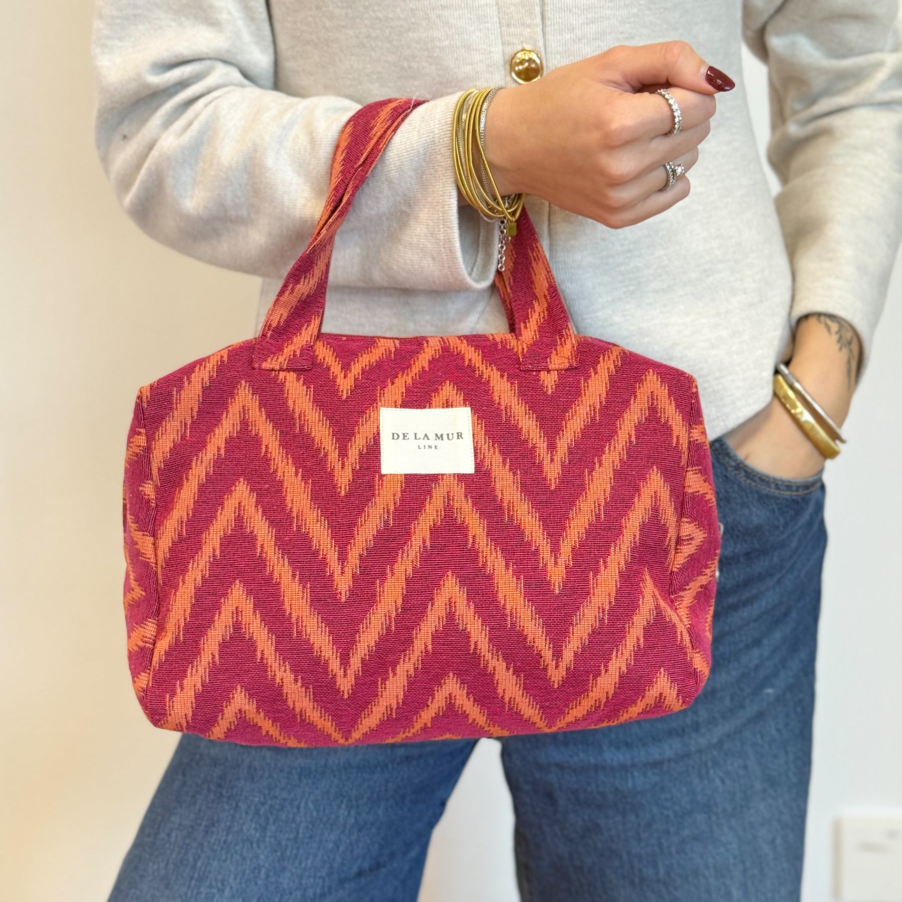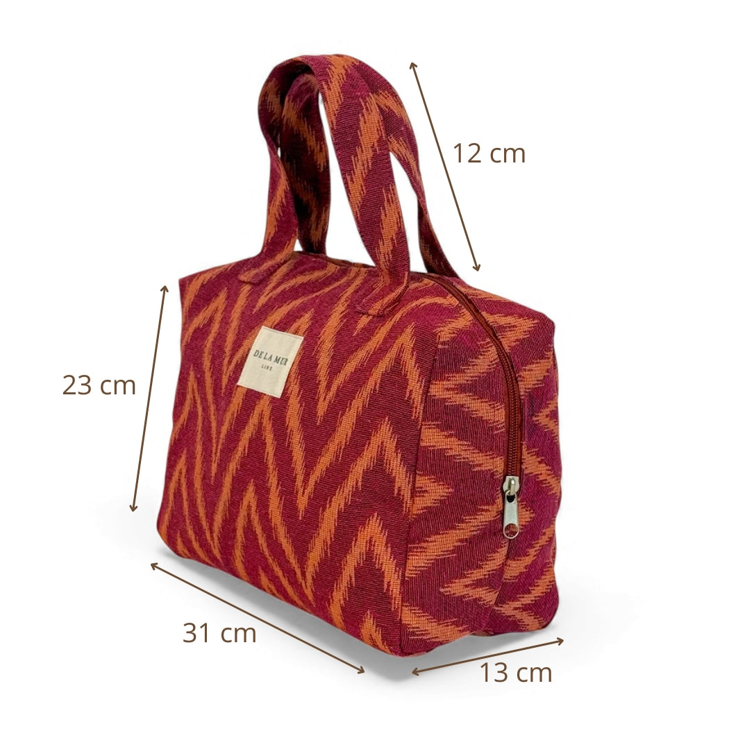 Neceser extra grande con cremallera en la parte superior y asas de tela en la parte superior. Con tejido grueso de jacquard 80% algodón y 20% poliéster con estampado geométrico en tono rosa fucsia y naranja. Forrado de tejido grueso de color gris en la parte interior. Para su correcto mantenimiento se aconseja lavarlo en frío y no utilizar secadora.