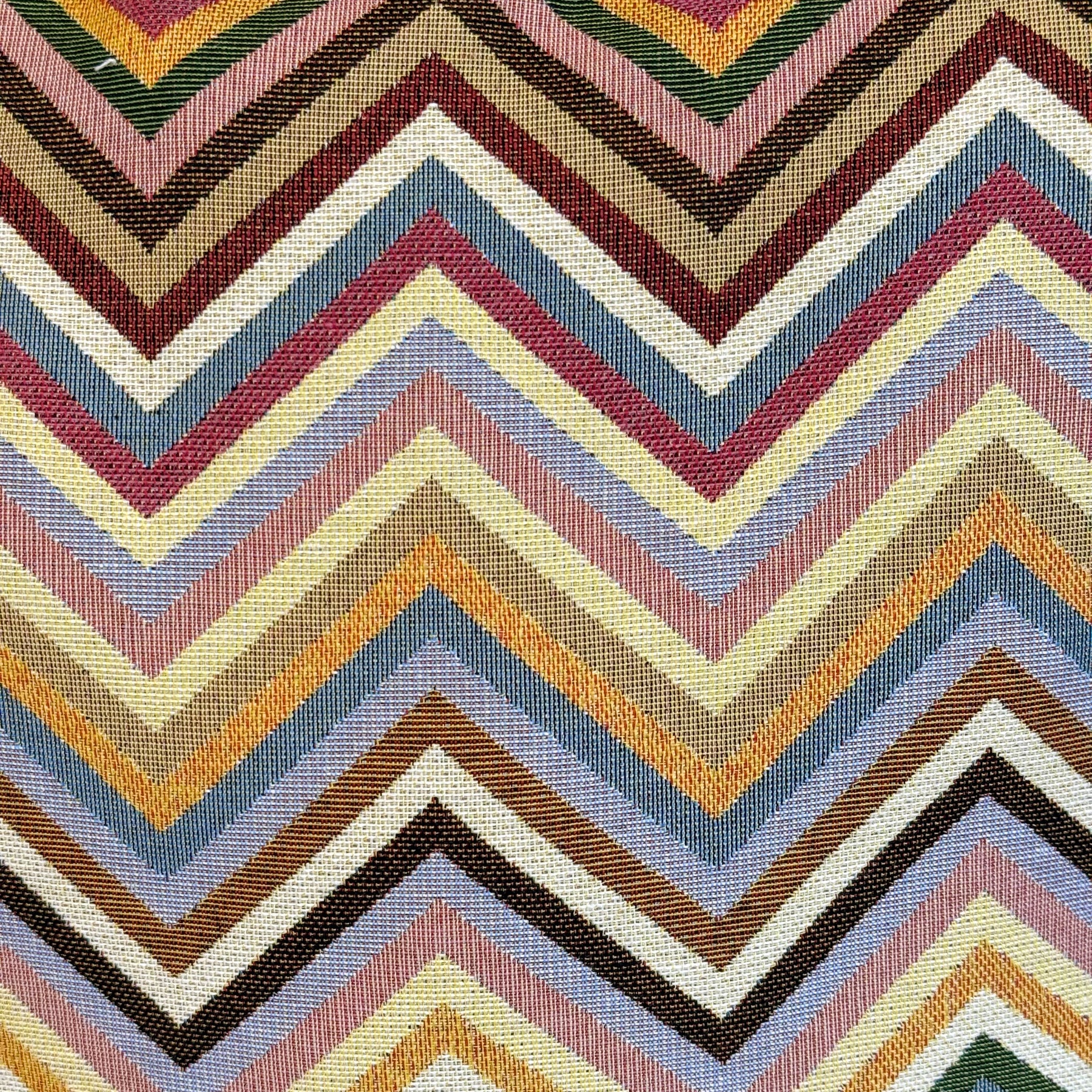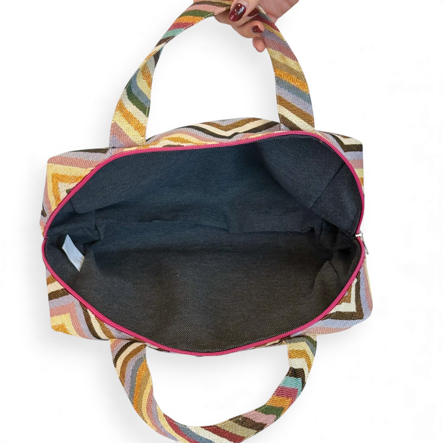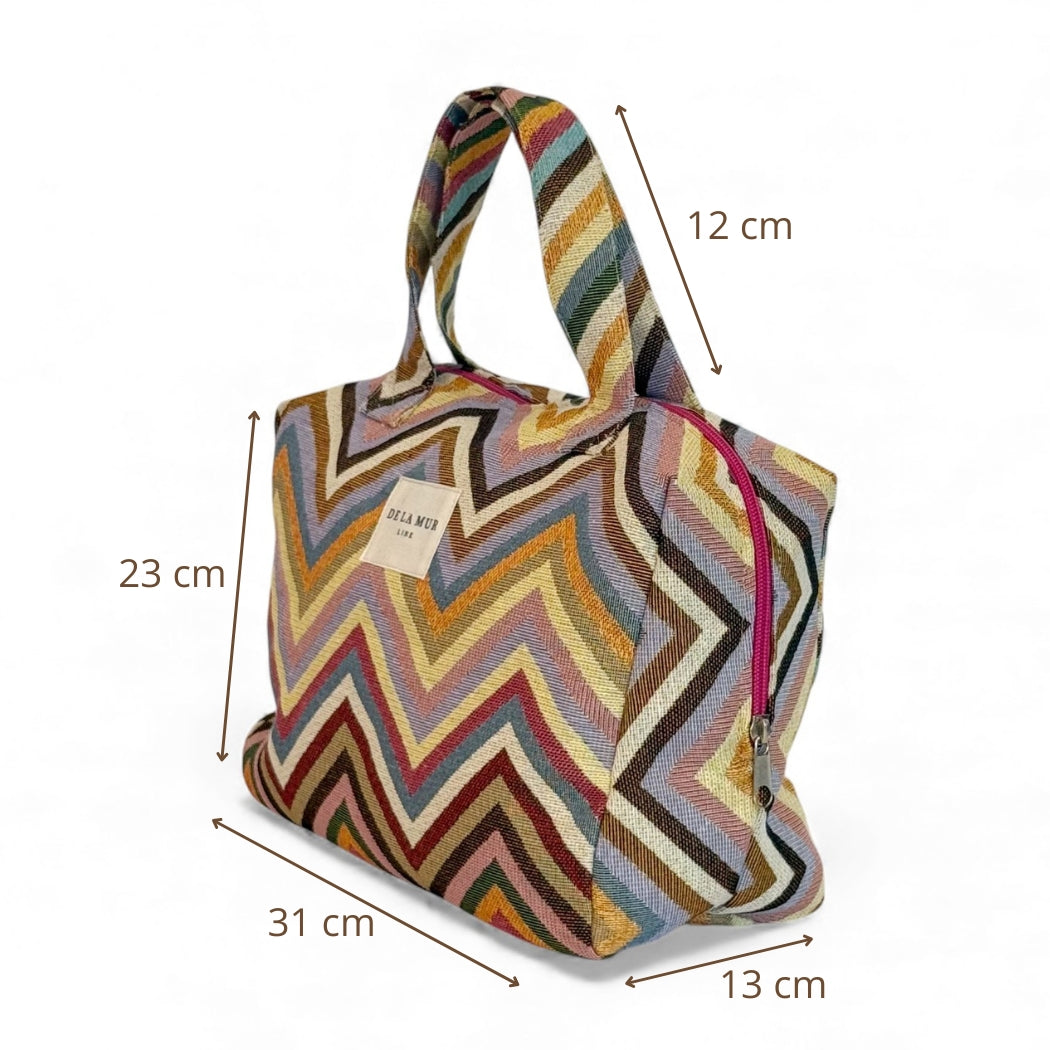 Neceser extra grande con cremallera en la parte superior y asas de tela en la parte superior. Con tejido grueso de jacquard 80% algodón y 20% poliéster con estampado geométrico tipo zigzag multicolor. Forrado de tejido grueso de color gris en la parte interior. Para su correcto mantenimiento se aconseja lavarlo en frío y no utilizar secadora.