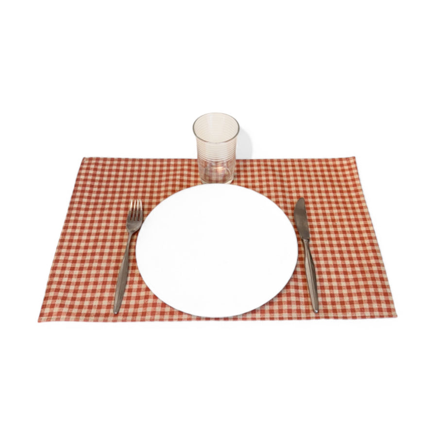 Individual resinado para mesa. Con tejido resinado con estampado a cuadros vichy en tono teja y beige, resistente a manchas y fácil limpieza. Para su correcto mantenimiento se aconseja lavarlo en frío y no utilizar secadora.