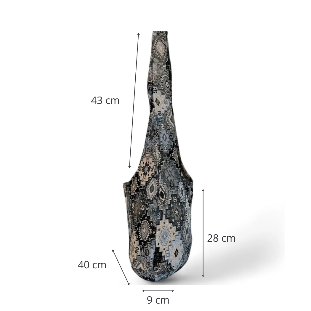 Bolsa ovalada con asas para llevar al hombro. Con un tejido grueso de jacquard con estampado étnico en tonos azul y gris. Para su correcto mantenimiento se aconseja lavarlo en frío a mano y no utilizar secadora.