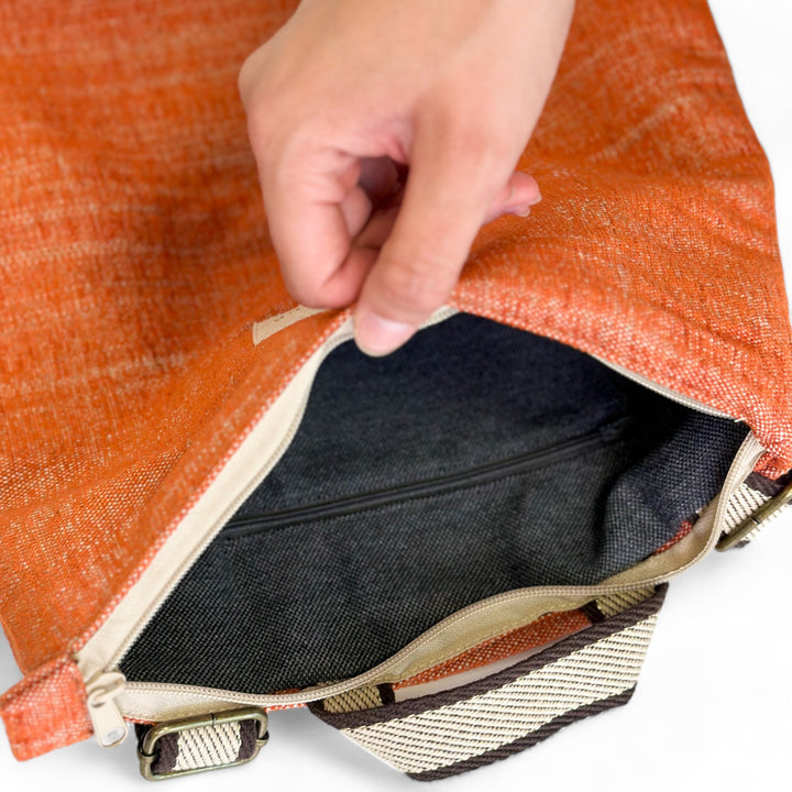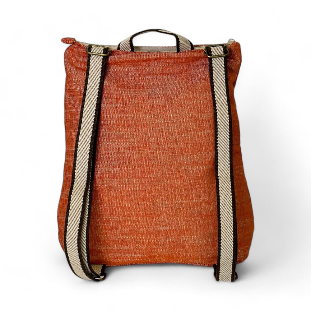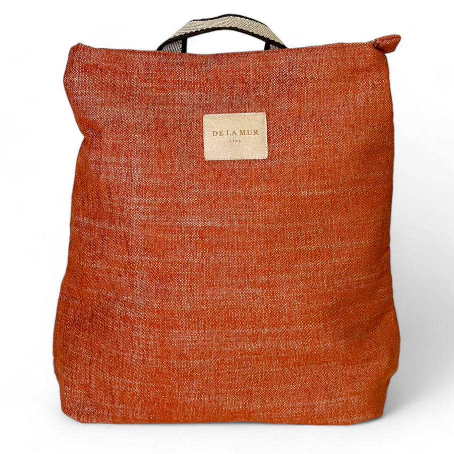 Mochila con asas ajustables y pequeña asa de mano. Con un tejido liso efecto desgastado de color teja. Bolsillo interior con cremallera. Asas de cinta de espiga de algodón de color beige con lurex con marrón en los laterales. Etiqueta de marca de polipiel. Para su correcto mantenimiento se aconseja lavarlo en frío y no utilizar secadora.