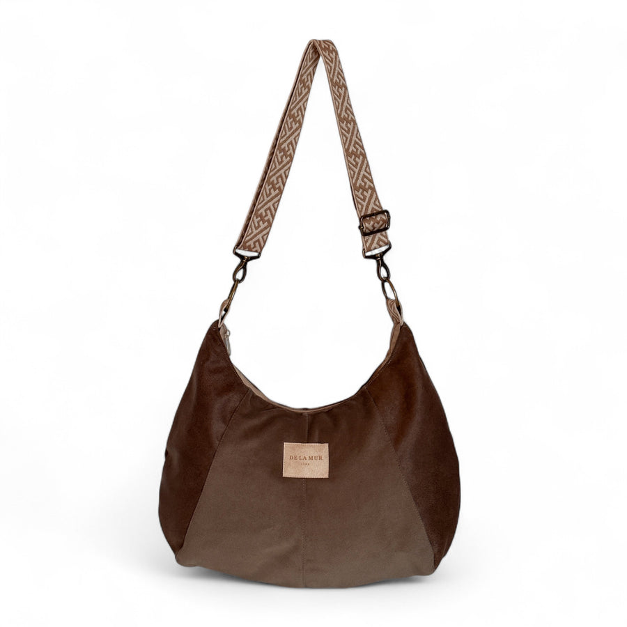 Bolso mediano edición limitada con asa larga ajustable. Combinado con dos tejidos, uno de piel de melocotón de color topo y otro con efecto polipiel de color topo en los laterales. Opción de llevarlo al hombro o como bandolera. Bolsillo interior con cremallera. Asa de cinta de espiga de algodón con dibujo geométrico beige y blanco. Etiqueta de marca de polipiel. Para su correcto mantenimiento se aconseja lavarlo en frío a mano y no utilizar secadora.