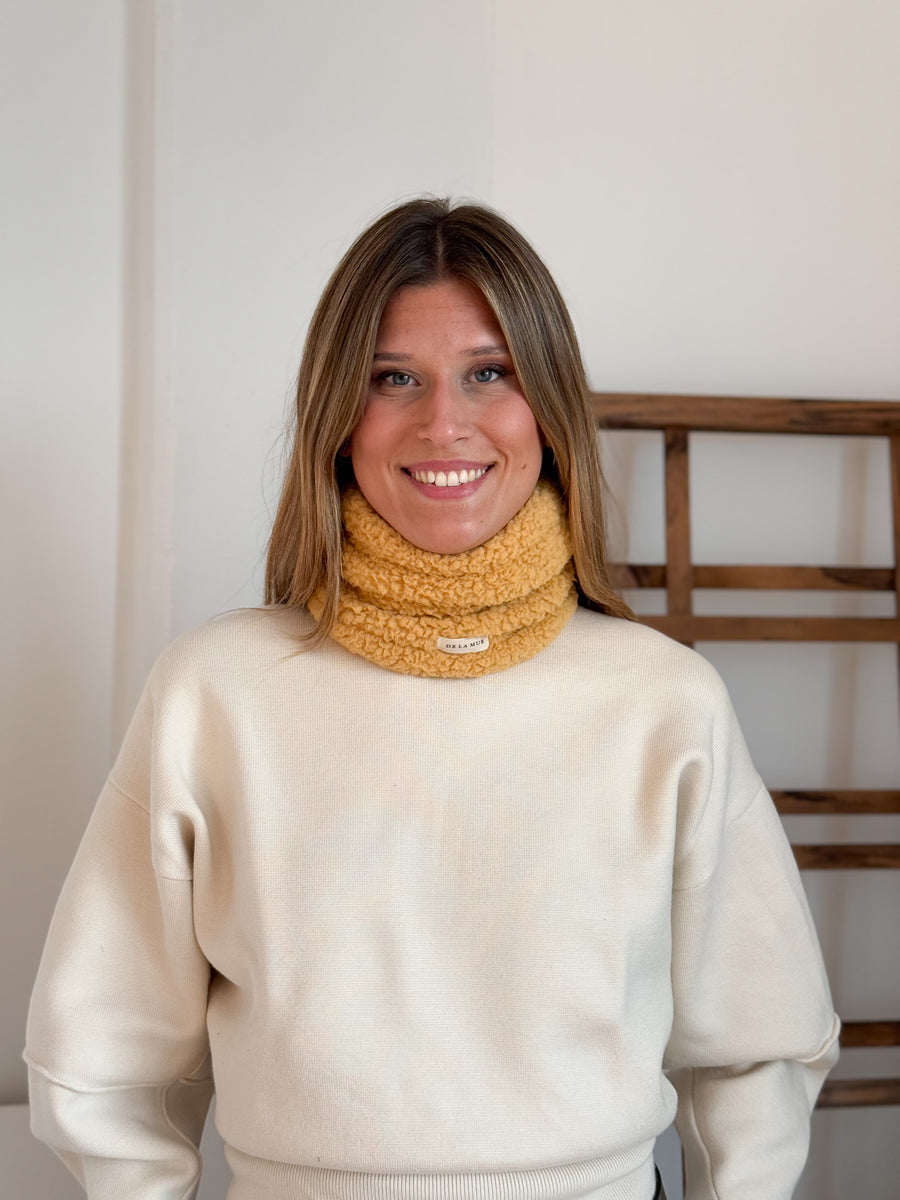 Braga para el cuello con tejido grueso de borreguito, suave y cálido de color mostaza. Para su correcto mantenimiento se aconseja lavarlo en frío y no utilizar secadora.