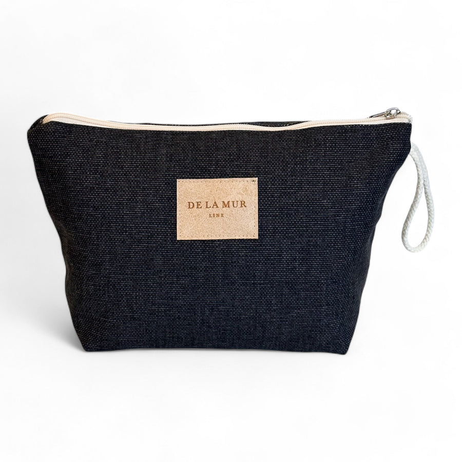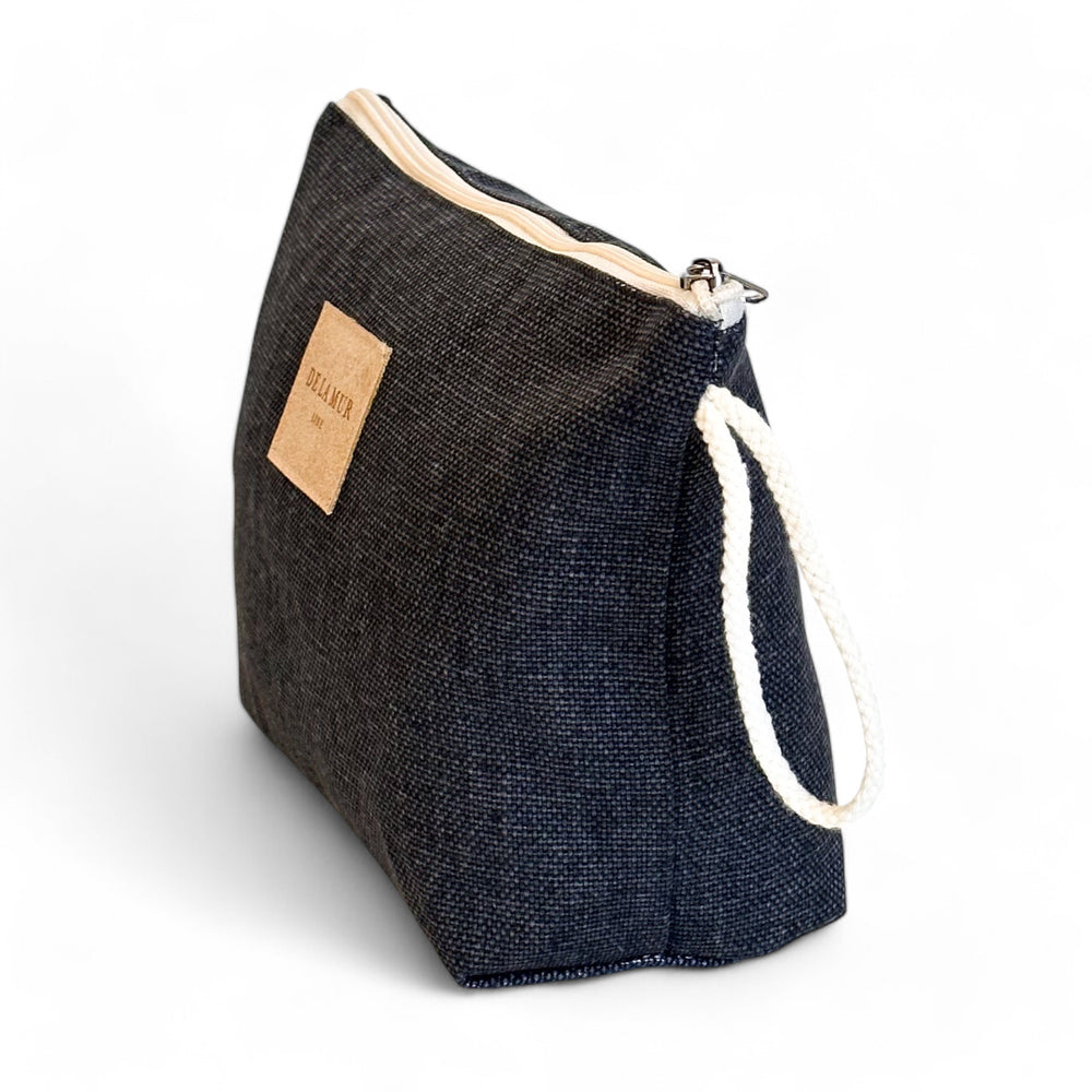 Neceser con cremallera en la parte superior y asa de cordón de color crudo en el lateral. Con tejido grueso de color gris oscuro. Forrado de tejido grueso de color gris en la parte interior. Etiqueta de marca de polipiel. Para su correcto mantenimiento se aconseja lavarlo en frío a mano y no utilizar secadora.