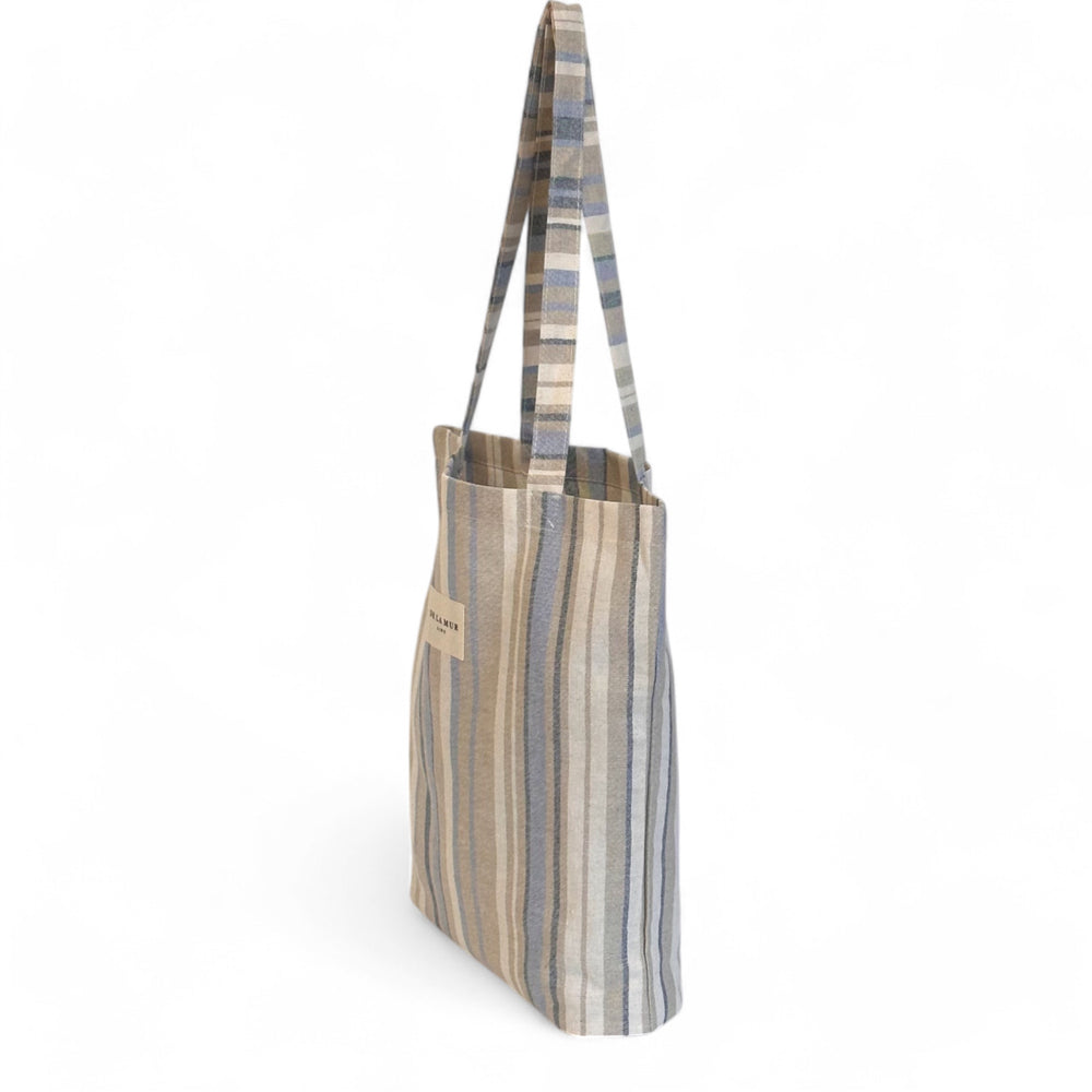 Bolsa "tote bag" con asas para llevar al hombro. Con tejido fino de half-panama con estampado a rayas en tonos azul y crudo. Para su correcto mantenimiento se aconseja lavarlo en frío y no utilizar secadora.