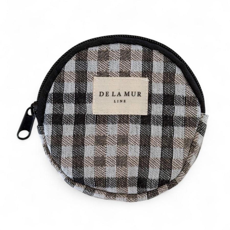 Monedero redondo con cremallera en la parte superior y pequeña asa de cordón de color negro en el lateral. Con tejido grueso de jacquard con estampado a cuadros de color beige y negro. Cada articulo puede tener una variación en el estampado, dependiendo de donde se haya efectuado el corte de la pieza. Forrado de tejido grueso de color gris en la parte interior. Para su correcto mantenimiento se aconseja lavarlo en frío a mano y no utilizar secadora.