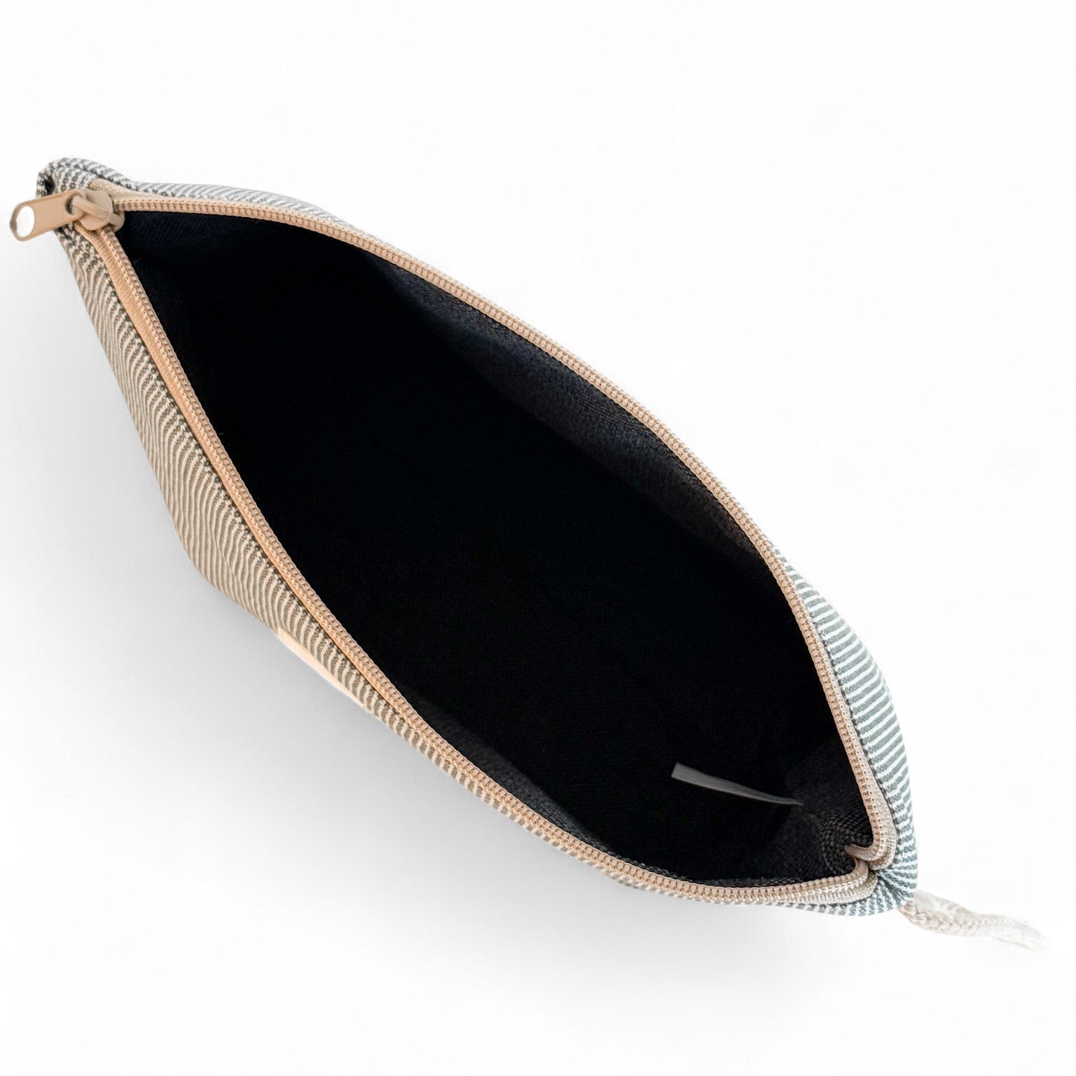 Neceser con cremallera en la parte superior y asa de cordón de color beige en el lateral. Con tejido grueso a rayas muy finas gris oscuro. Para su correcto mantenimiento se aconseja lavarlo en frío a mano y no utilizar secadora.