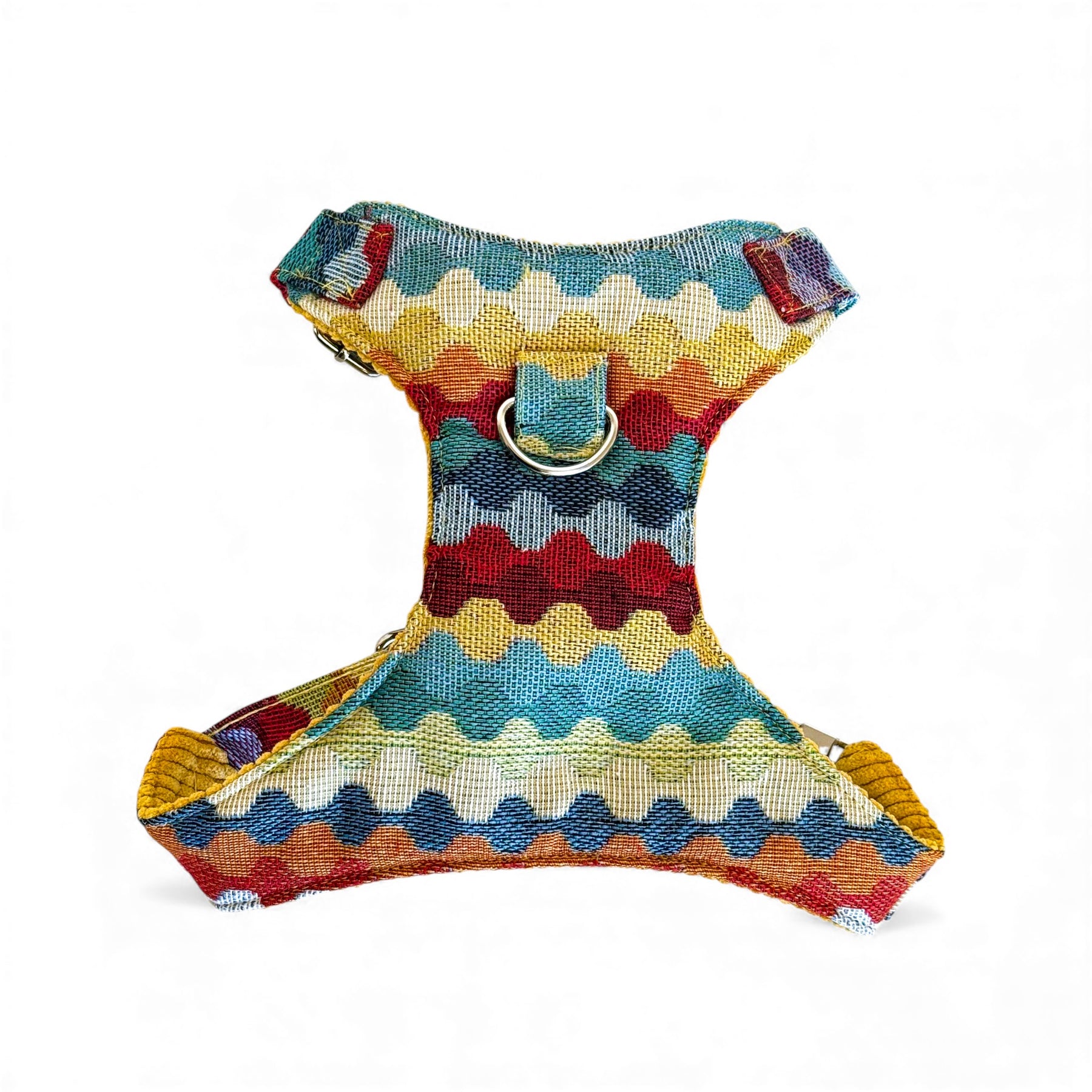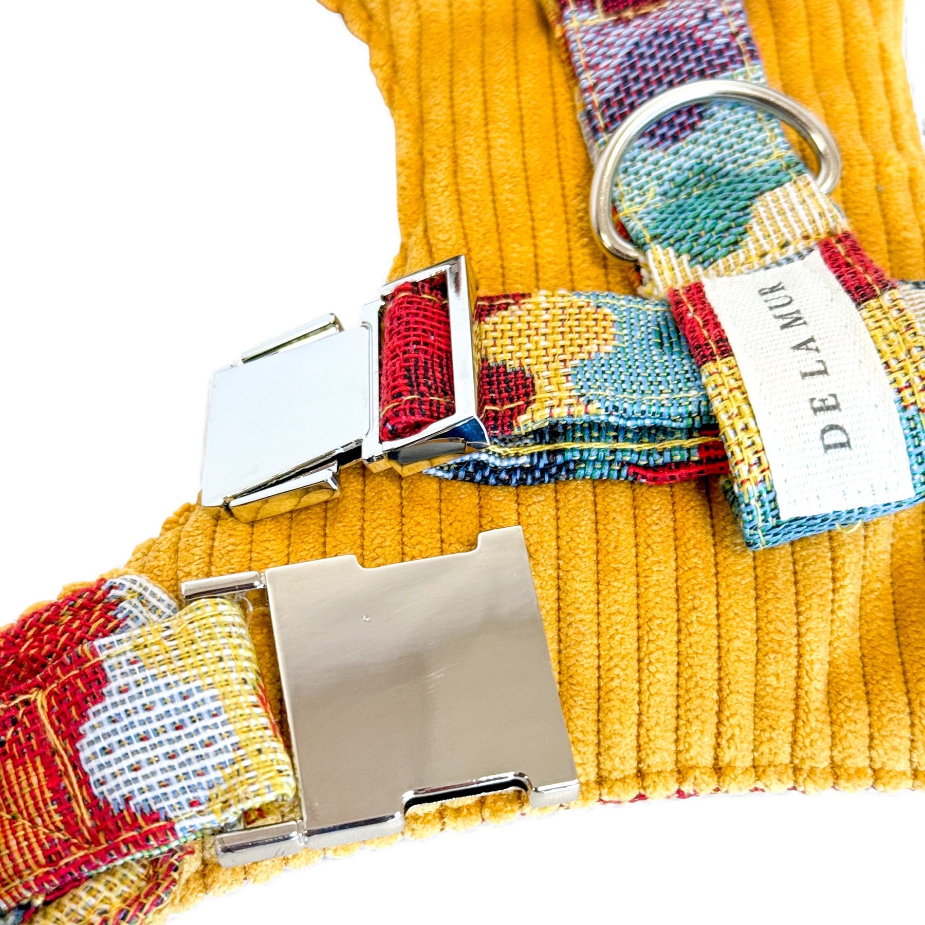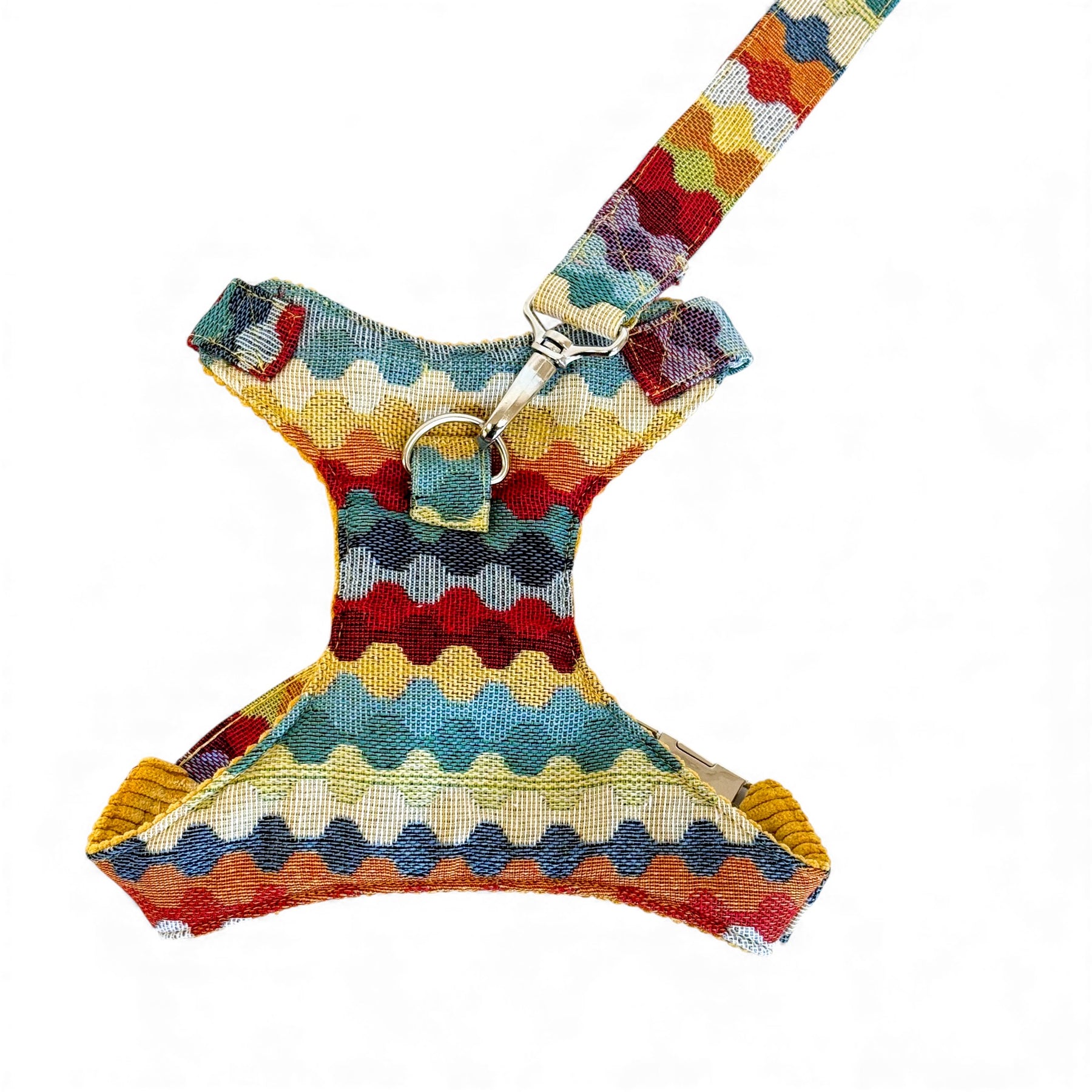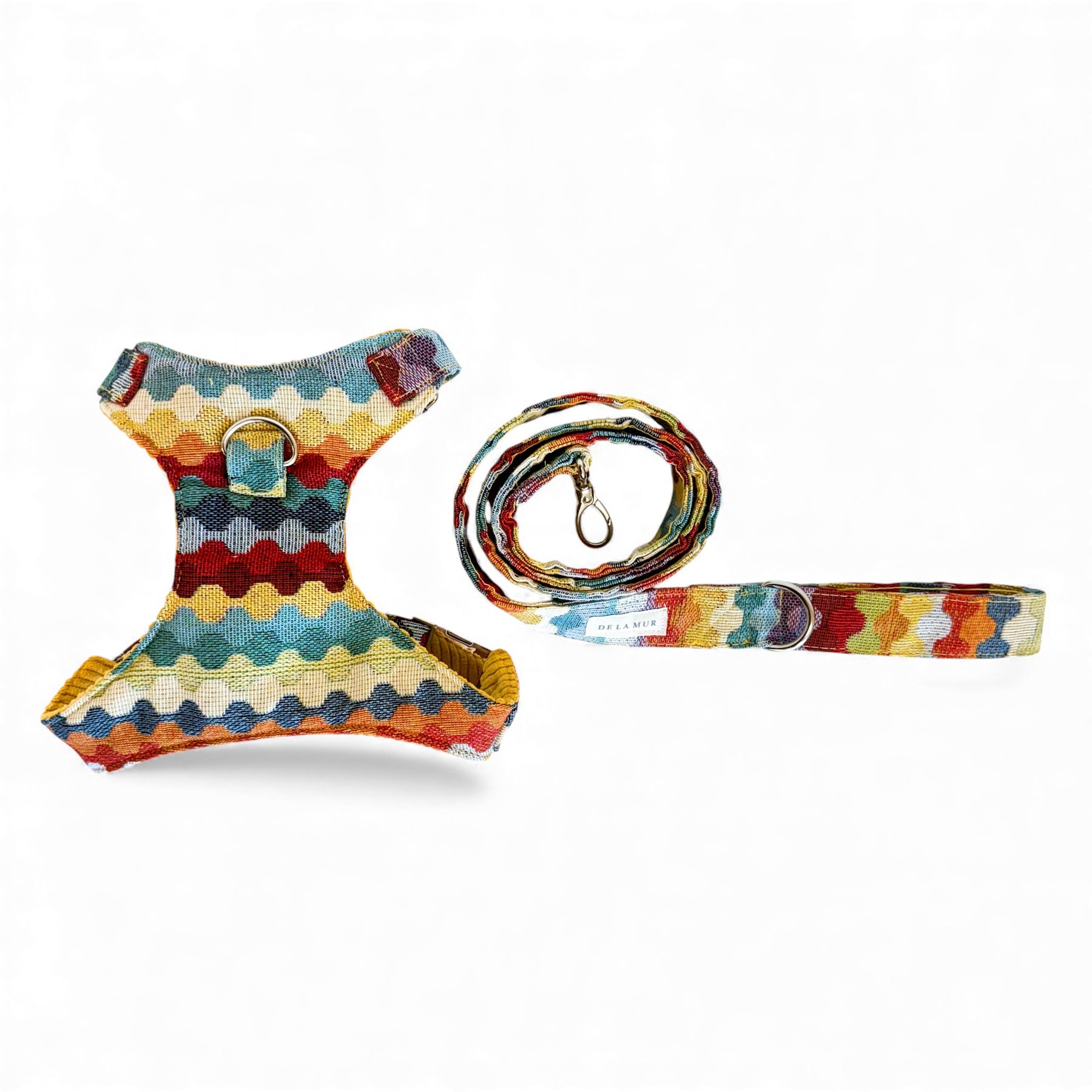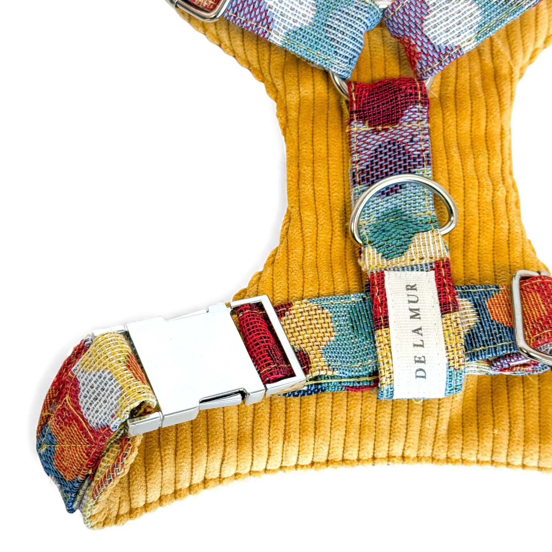 El Pack Arnés y Correa Ritzo nace para disfrutar del paseo como un ritual compartido. Su diseño envolvente acompaña el movimiento con naturalidad, aportando seguridad sin rigidez y una sensación de equilibrio constante. El frontal amplio abraza el pecho con suavidad, adaptándose al cuerpo del perro y favoreciendo una experiencia cómoda y fluida en cada salida. Con tejido de jacquard con estampado multicolor combinado con un tejido de pana mostaza. Con espuma blanda entre tejidos para que tu peludito vaya cómodo.