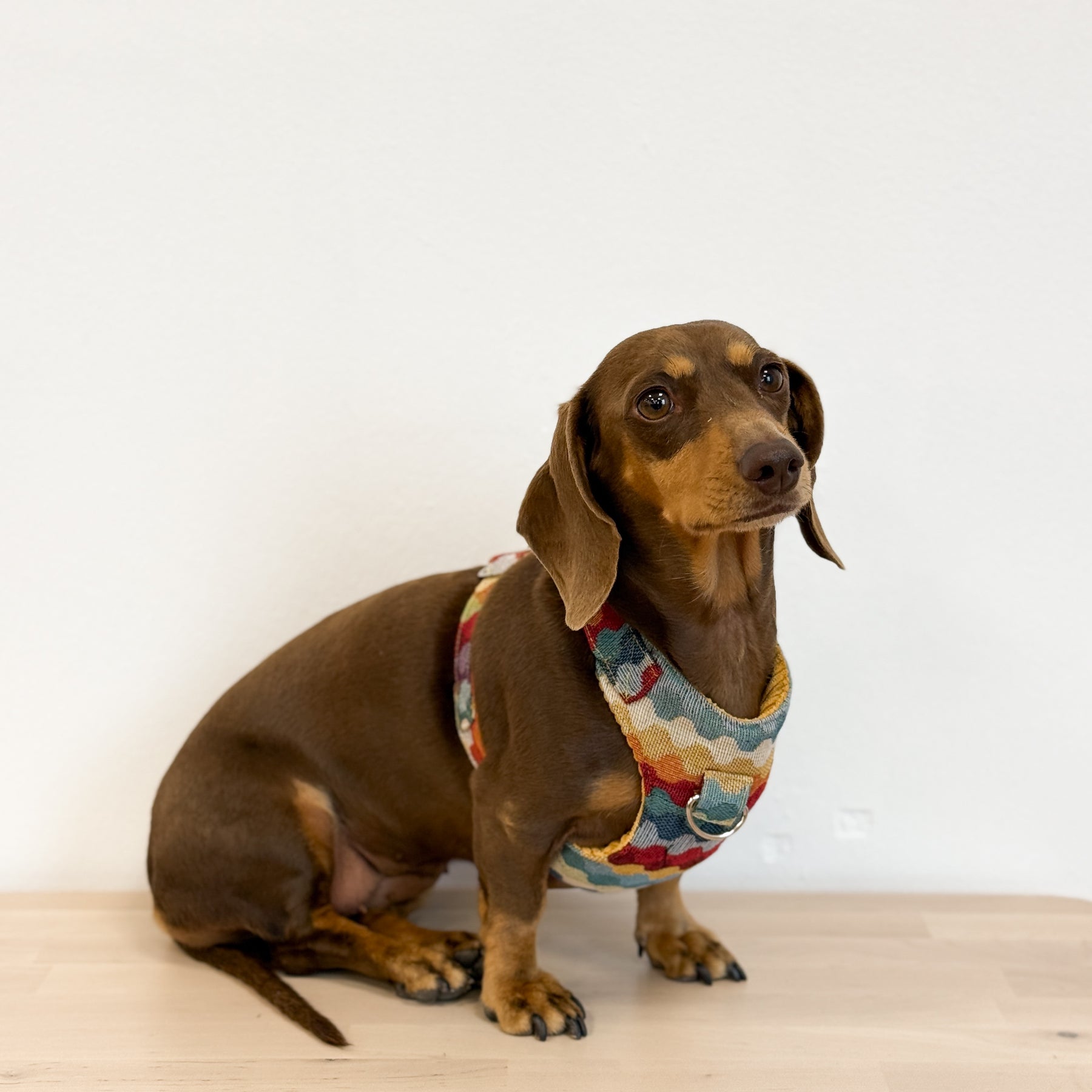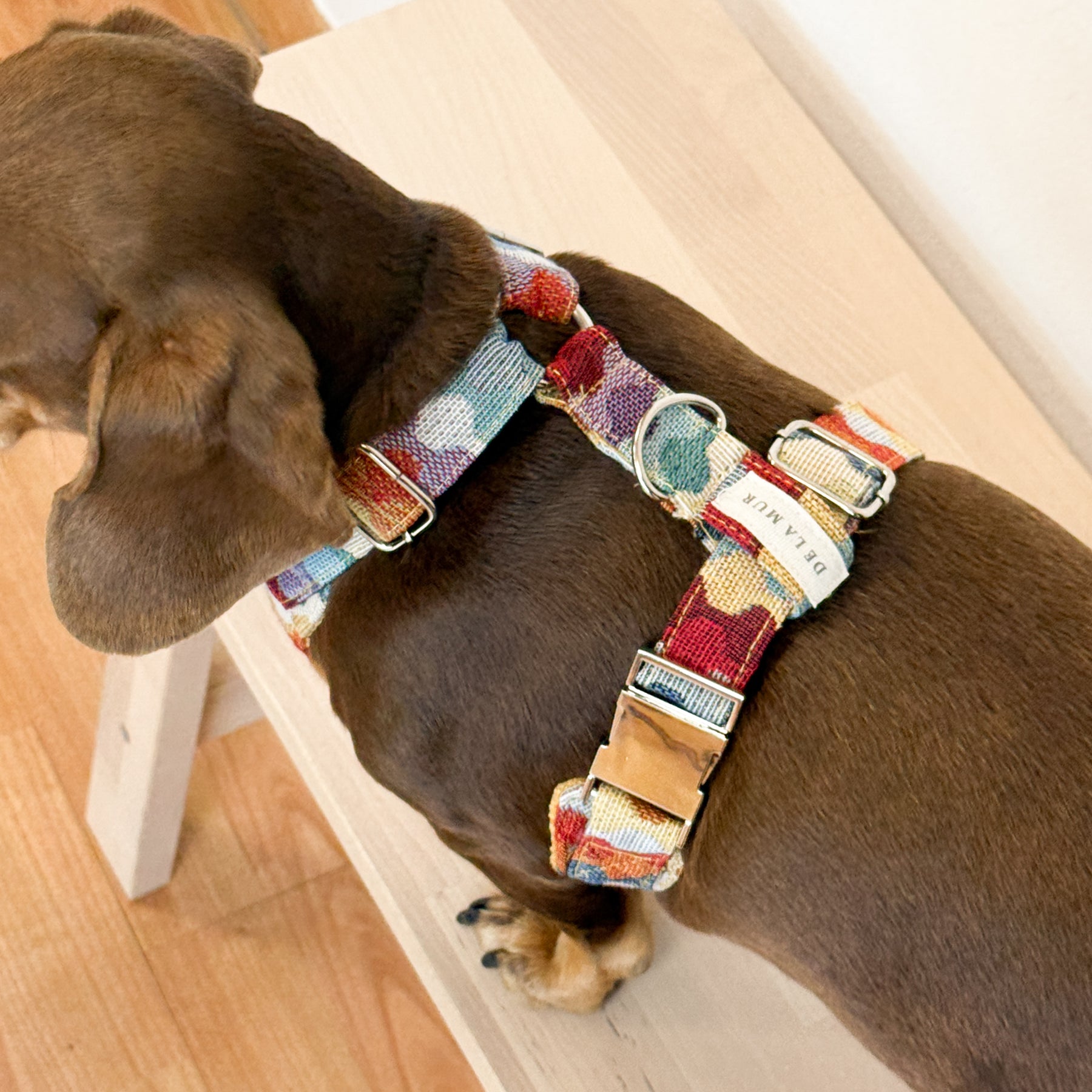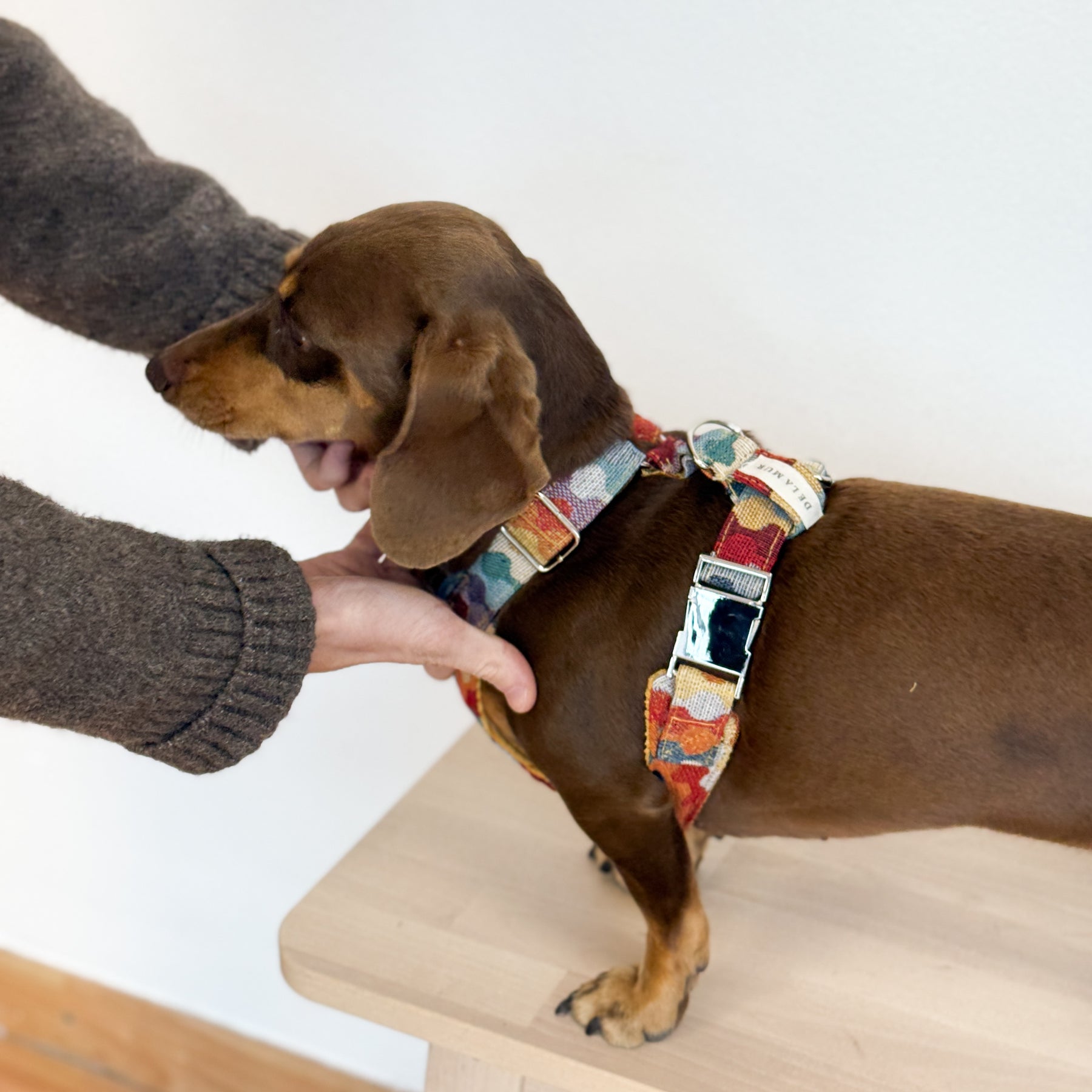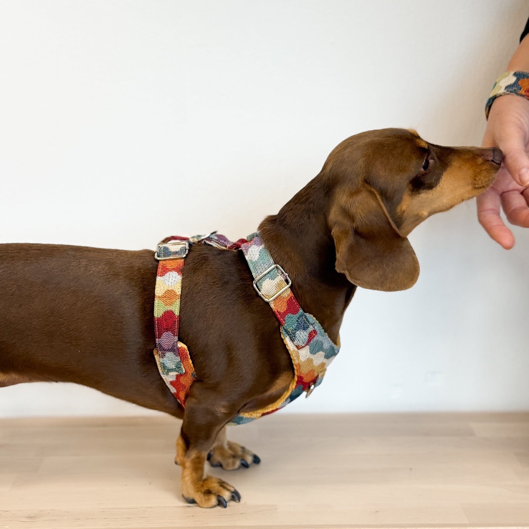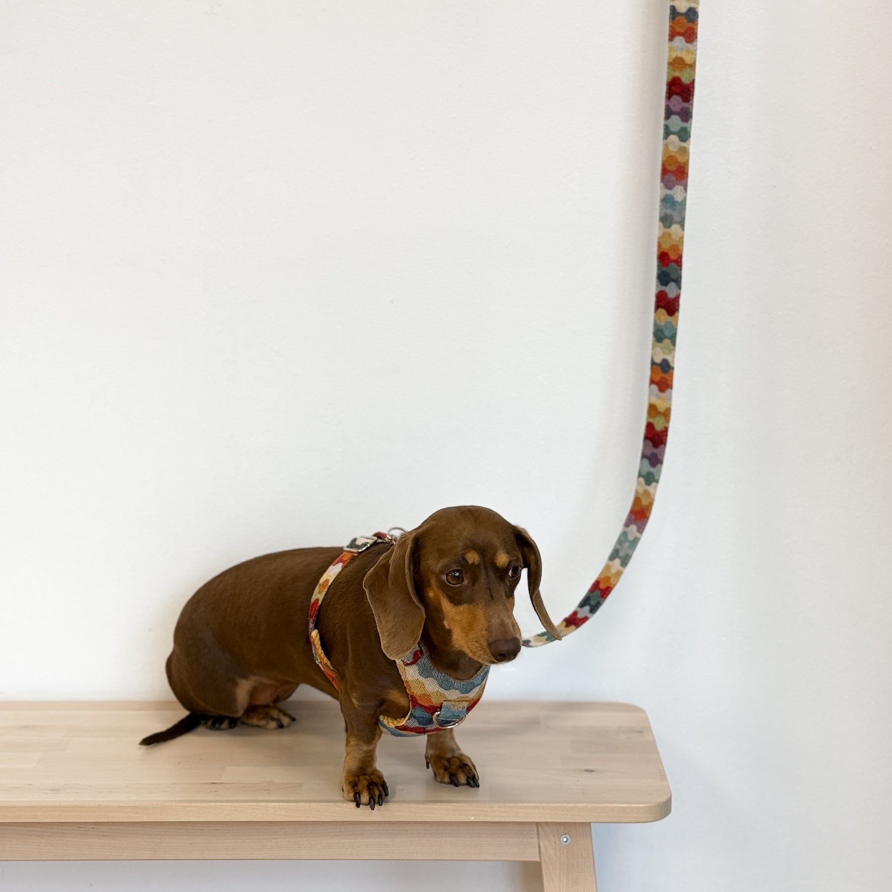 El Pack Arnés y Correa Ritzo nace para disfrutar del paseo como un ritual compartido. Su diseño envolvente acompaña el movimiento con naturalidad, aportando seguridad sin rigidez y una sensación de equilibrio constante. El frontal amplio abraza el pecho con suavidad, adaptándose al cuerpo del perro y favoreciendo una experiencia cómoda y fluida en cada salida. Con tejido de jacquard con estampado multicolor combinado con un tejido de pana mostaza. Con espuma blanda entre tejidos para que tu peludito vaya cómodo.