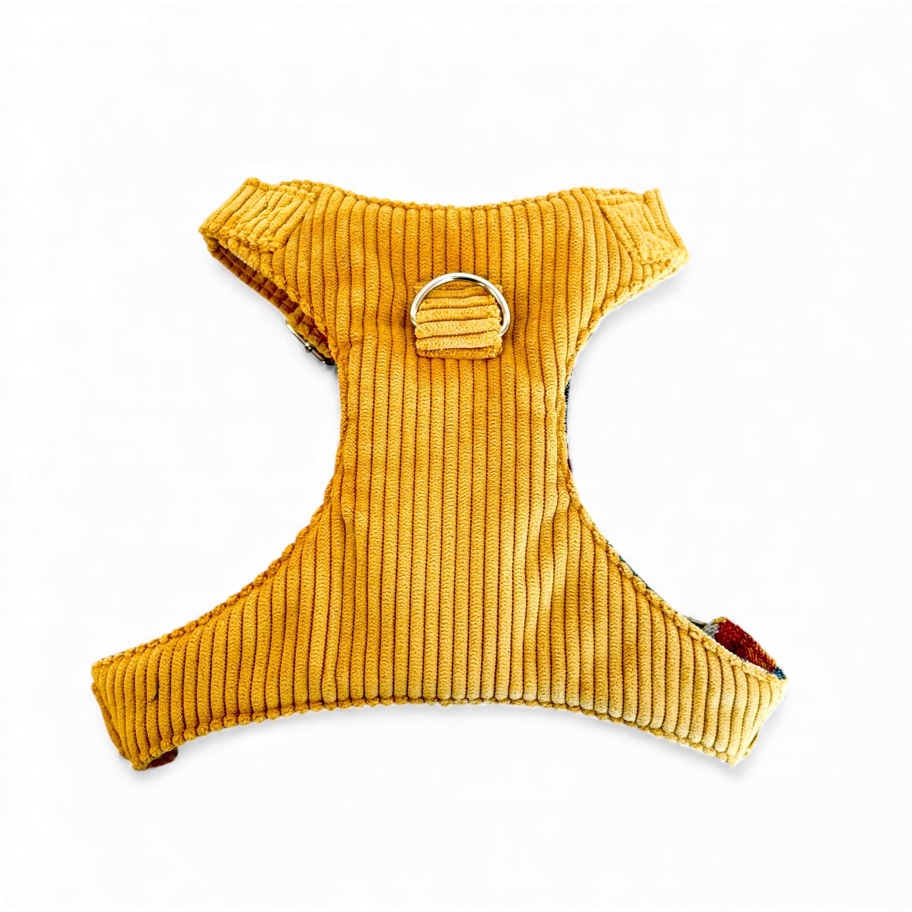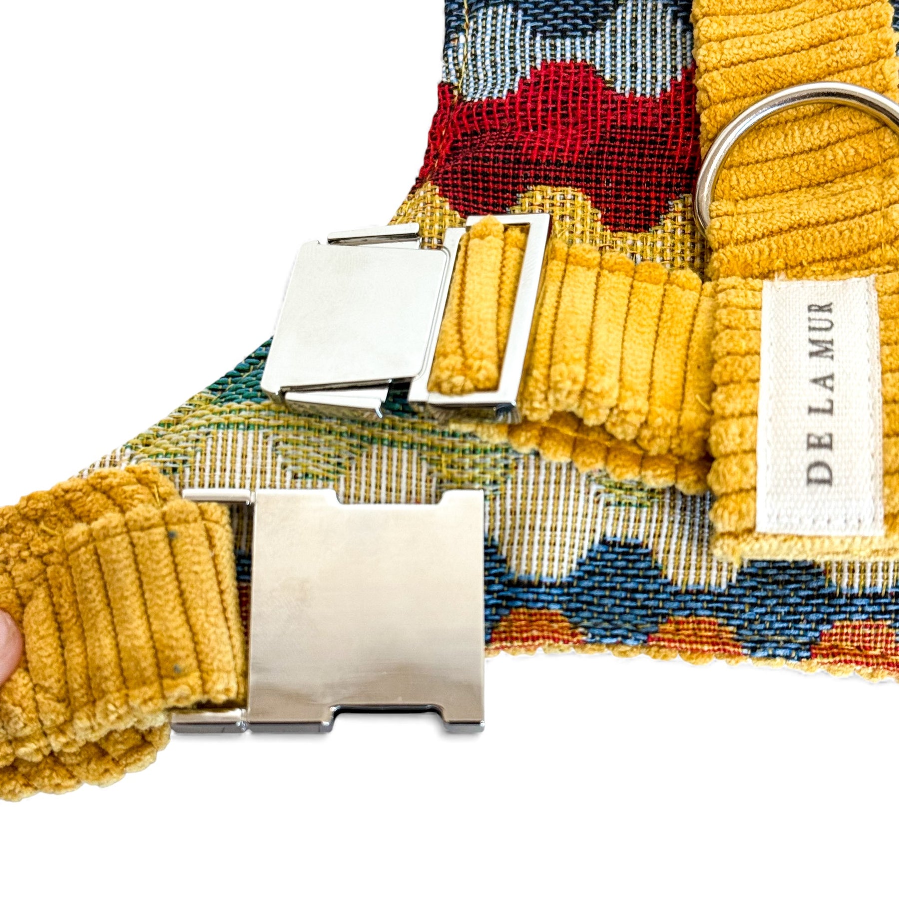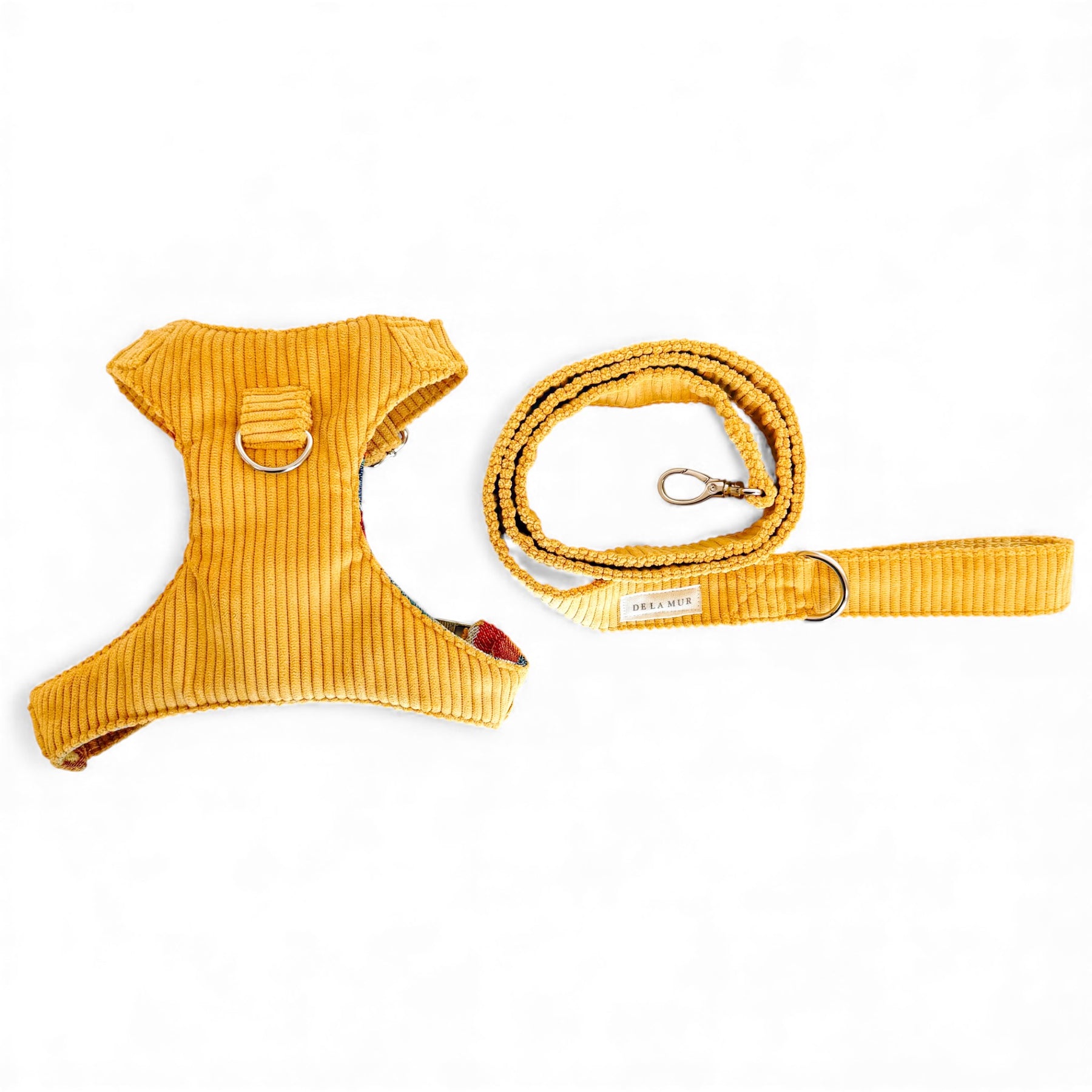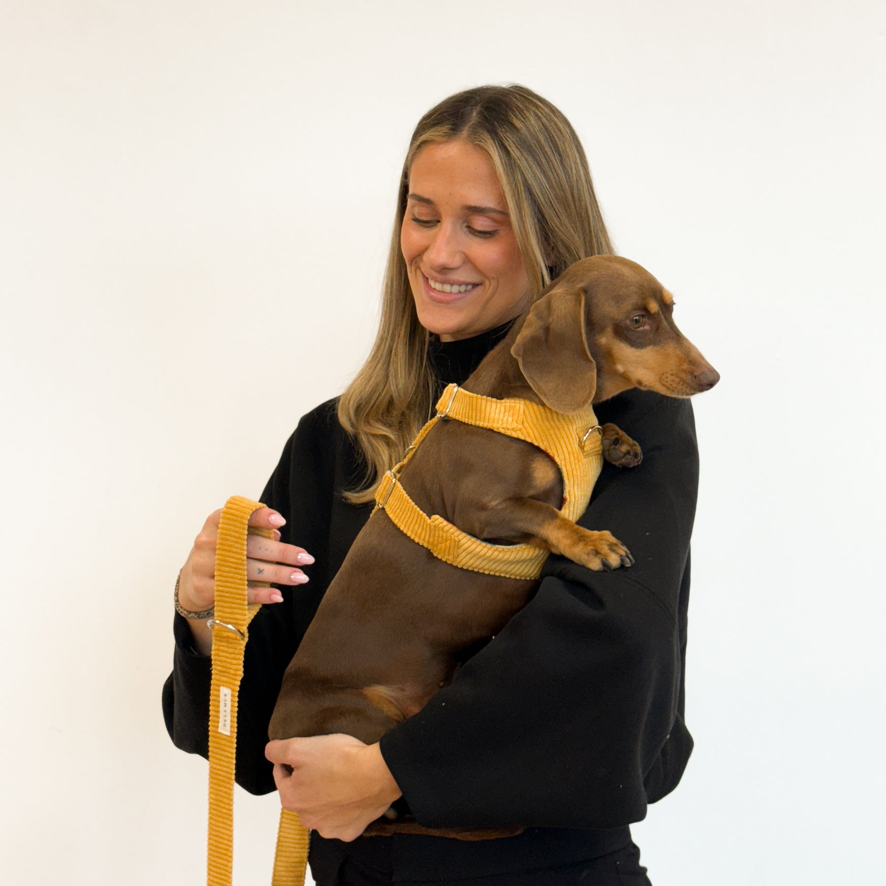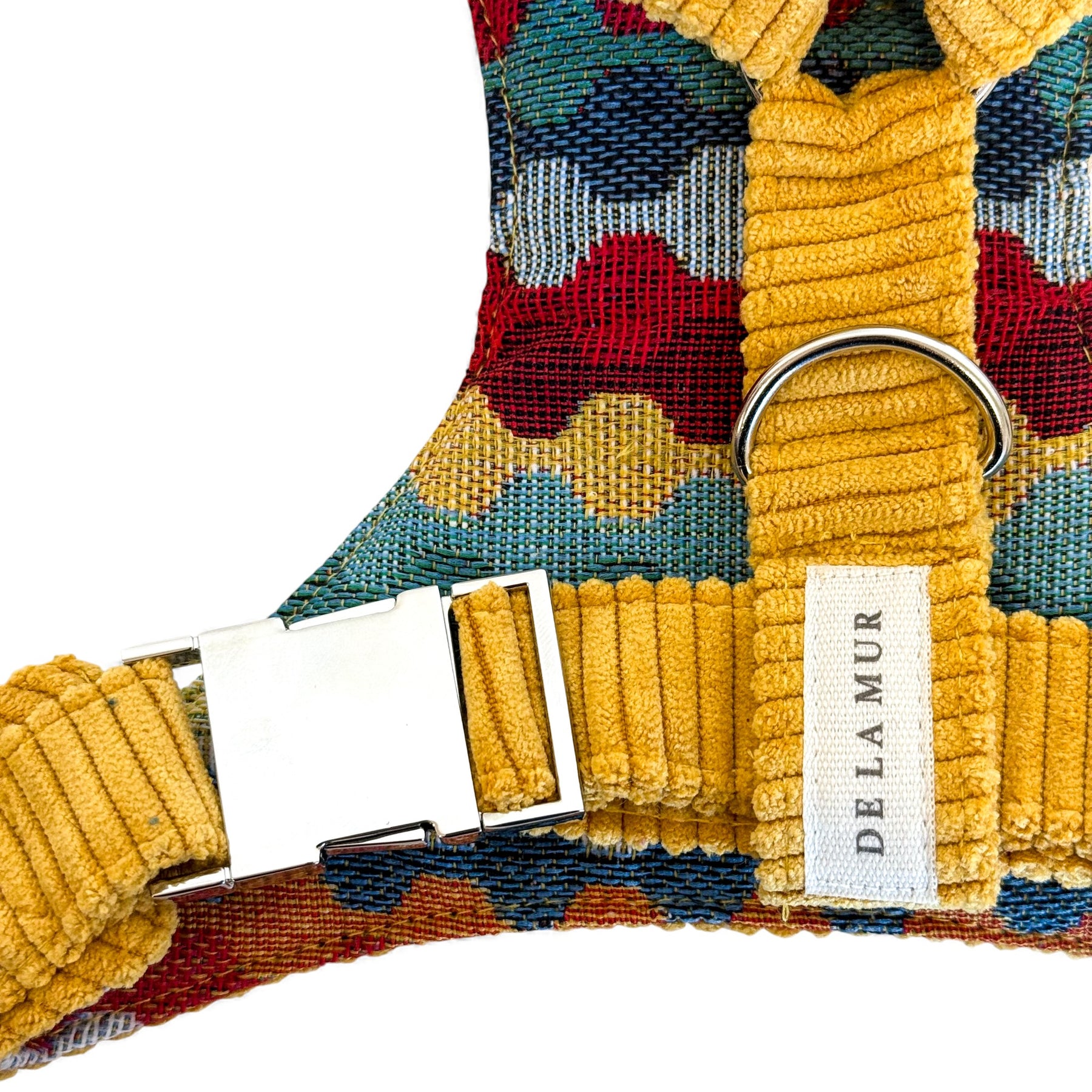 El Pack Arnés y Correa Taz nace para disfrutar del paseo como un ritual compartido. Su diseño envolvente acompaña el movimiento con naturalidad, aportando seguridad sin rigidez y una sensación de equilibrio constante. El frontal amplio abraza el pecho con suavidad, adaptándose al cuerpo del perro y favoreciendo una experiencia cómoda y fluida en cada salida. Con tejido de pana mostaza combinado con un tejido de jacquard con estampado multicolor. Con espuma blanda entre tejidos para que tu peludito vaya cómodo.