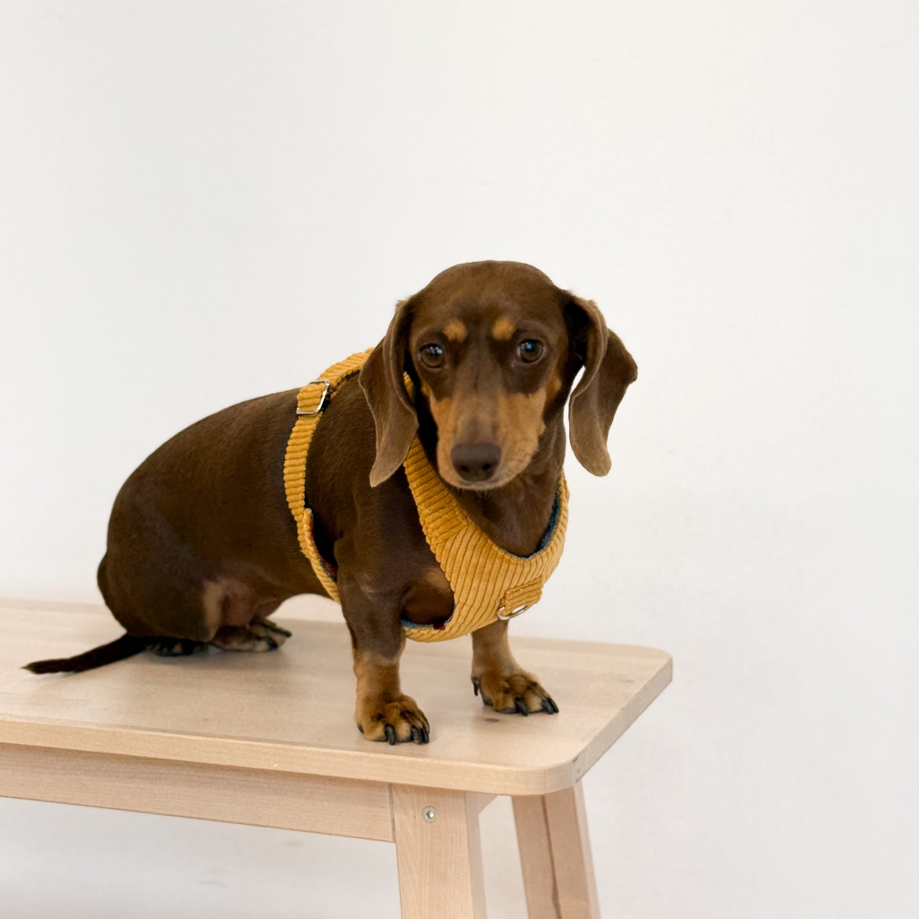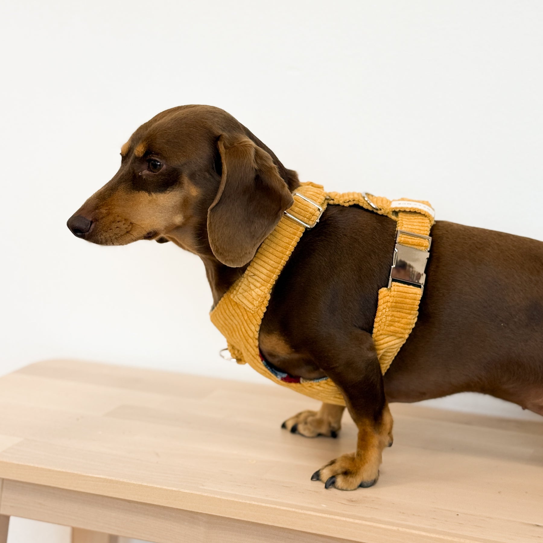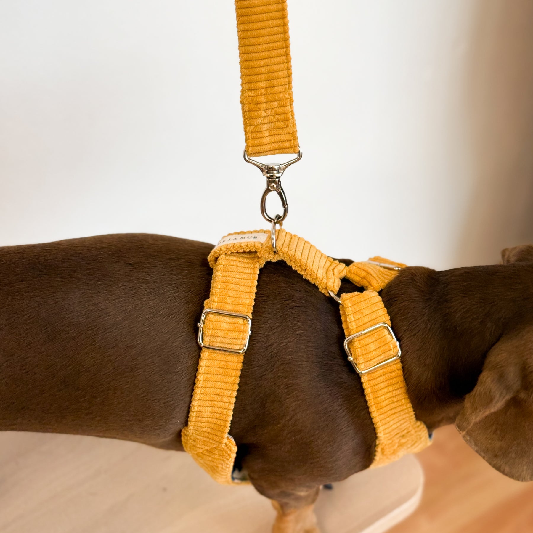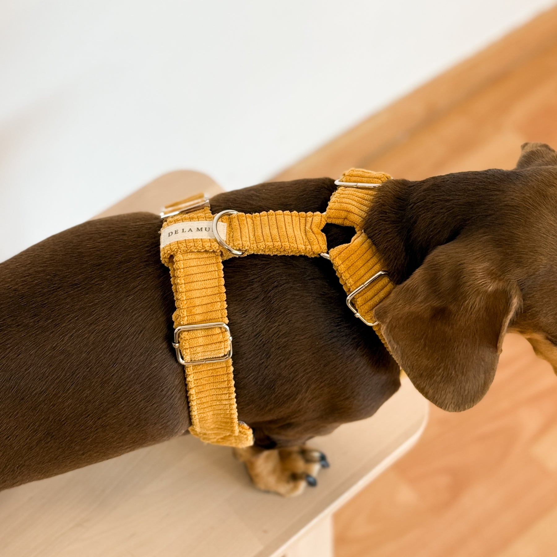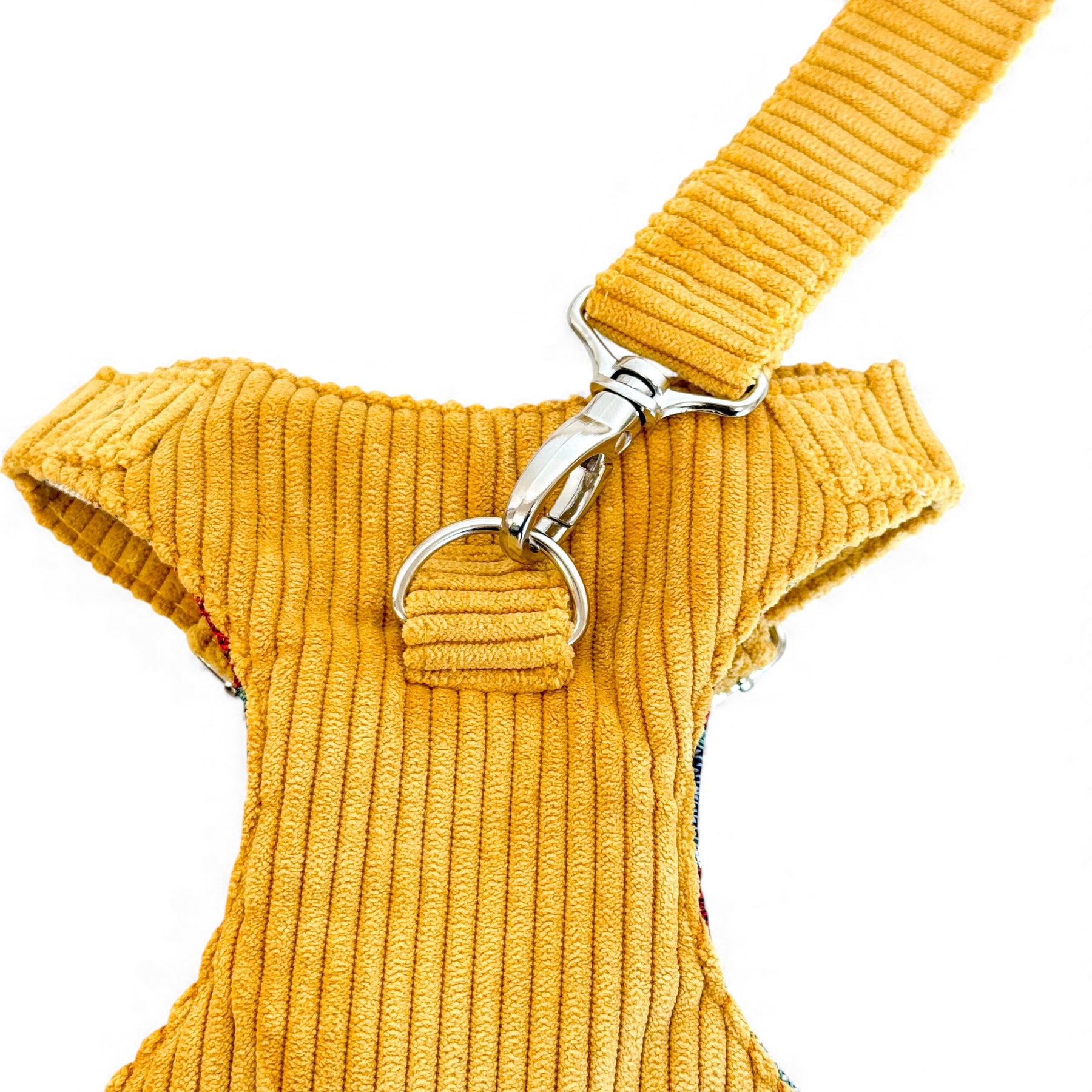 El Pack Arnés y Correa Taz nace para disfrutar del paseo como un ritual compartido. Su diseño envolvente acompaña el movimiento con naturalidad, aportando seguridad sin rigidez y una sensación de equilibrio constante. El frontal amplio abraza el pecho con suavidad, adaptándose al cuerpo del perro y favoreciendo una experiencia cómoda y fluida en cada salida. Con tejido de pana mostaza combinado con un tejido de jacquard con estampado multicolor. Con espuma blanda entre tejidos para que tu peludito vaya cómodo.