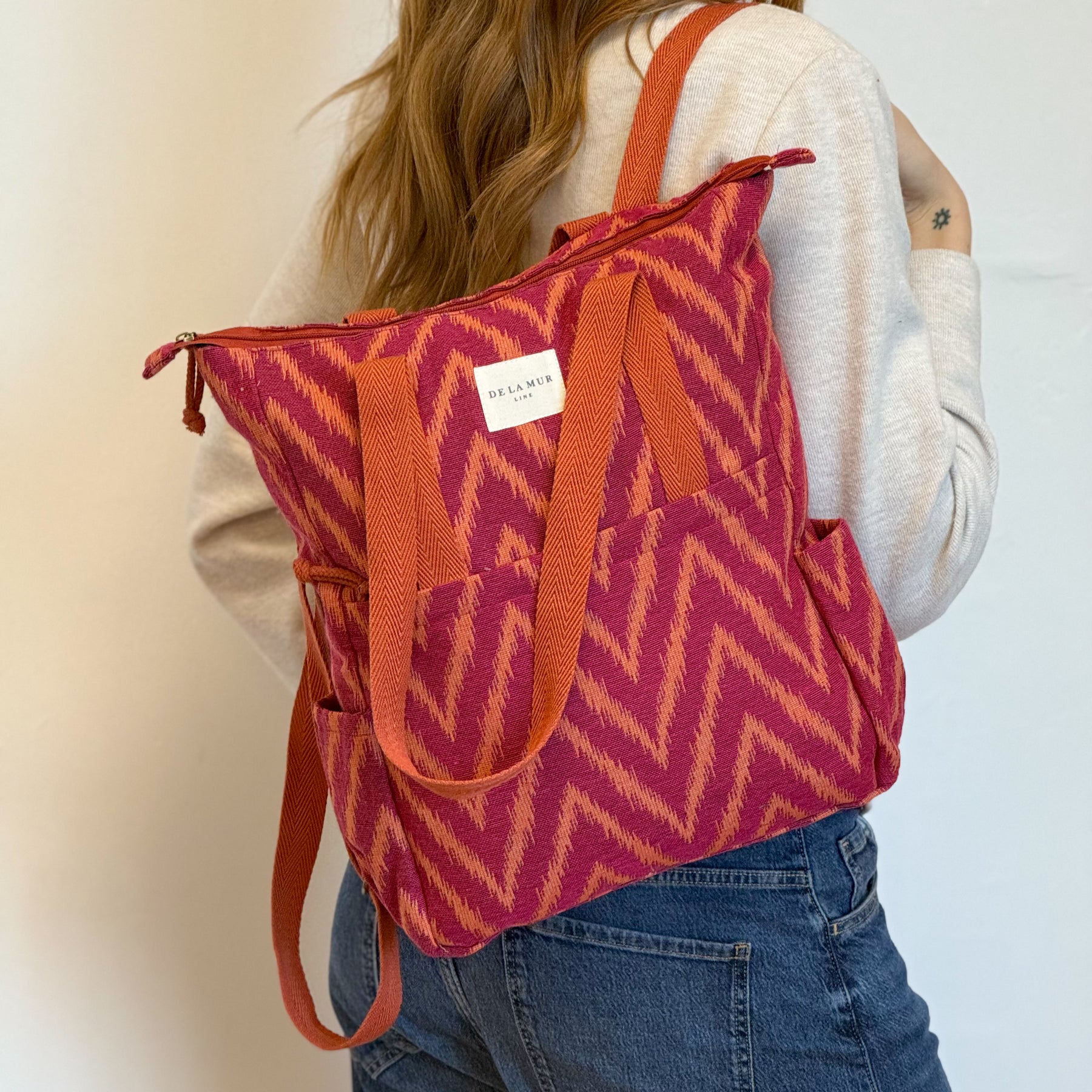 Mochila con asas ajustables y dos asas en la parte central para llevar al hombro tipo bolso. Con tejido grueso de jacquard 80% algodón y 20% poliéster con estampado tipo zigzag en tonos fucsia y naranja. Bolsillo interior con cremallera. Asas de cinta de espiga de algodón de color naranja. Para su correcto mantenimiento se aconseja lavarlo en frío y no utilizar secadora.