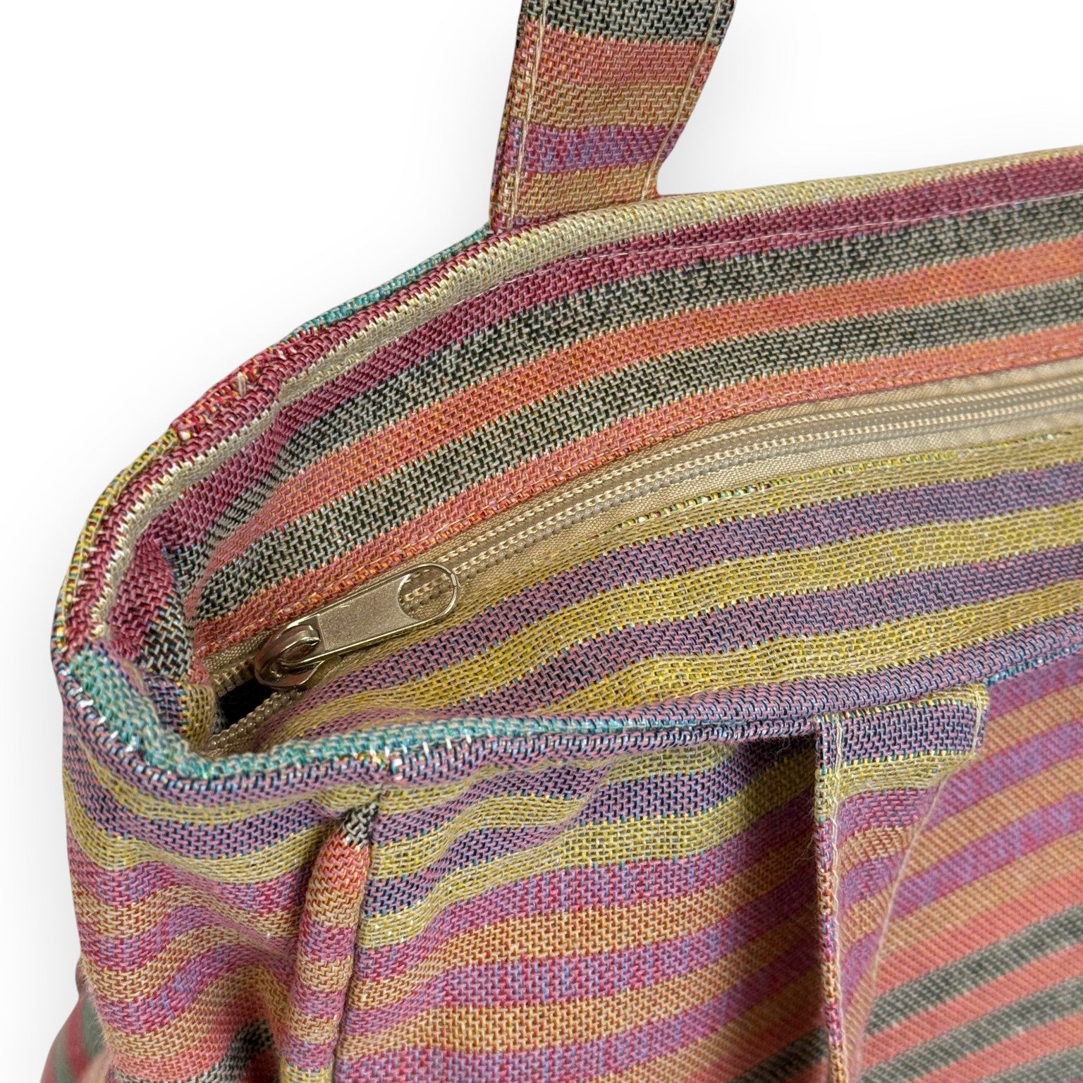 Bolsa mediana con cremallera en la parte superior y asas para llevar al hombro. Con bolsillos laterales. Con tejido grueso de jacquard 80% algodón y 20% poliéster con estampado a rayas horizontales multicolor. Para su correcto mantenimiento se aconseja lavarlo en frío a mano y no utilizar la secadora.