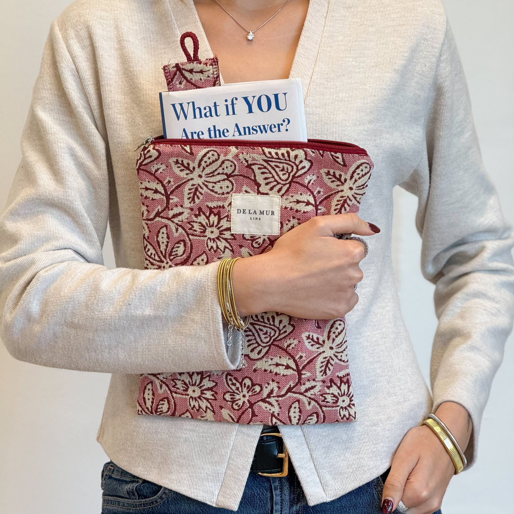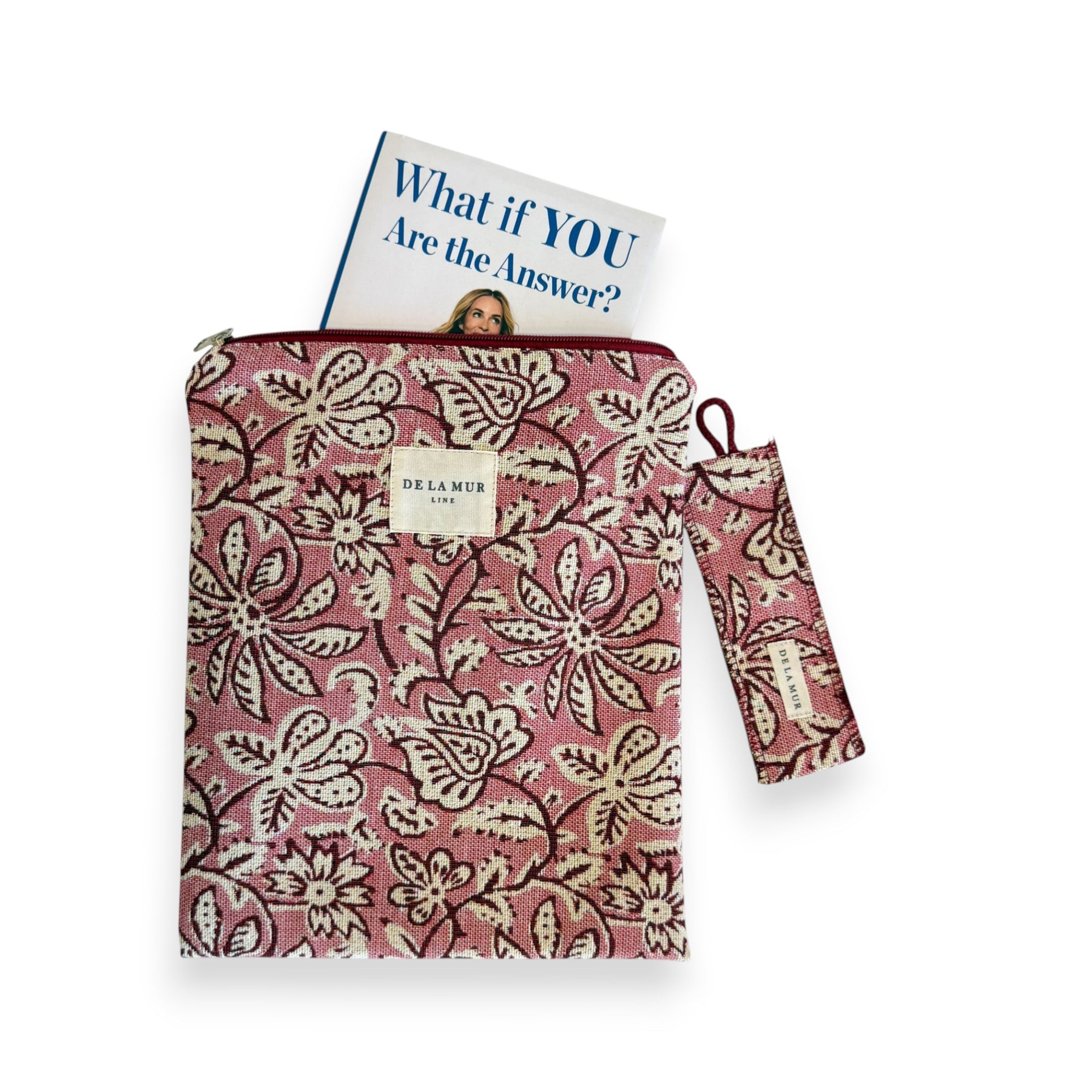 Funda de libro con cremallera con punto de libro a conjunto. Con un tejido grueso de jacquard 80% algodón y 20% poliéster con estampado floral en crudo sobre fondo rosa. Forrado de tejido grueso de color gris en la parte interior. Para su correcto mantenimiento se aconseja lavarlo en frío y no utilizar secadora.