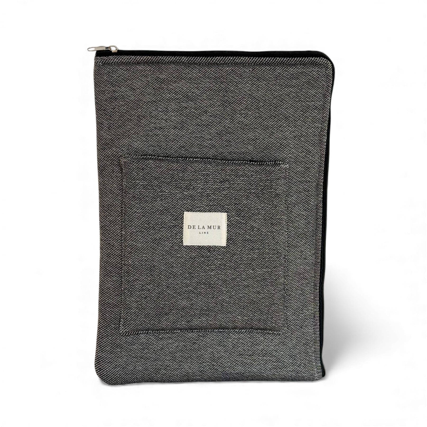 Funda de ordenador portátil con cremallera. Bolsillo exterior con velcro. Con capa interior de espuma para proteger. Con un tejido grueso de jacquard 80% algodón y 20% poliéster de color negro/gris oscuro. Forrado de tejido grueso de color gris en la parte interior. Para su correcto mantenimiento se aconseja lavarlo en frío a mano y no utilizar secadora.