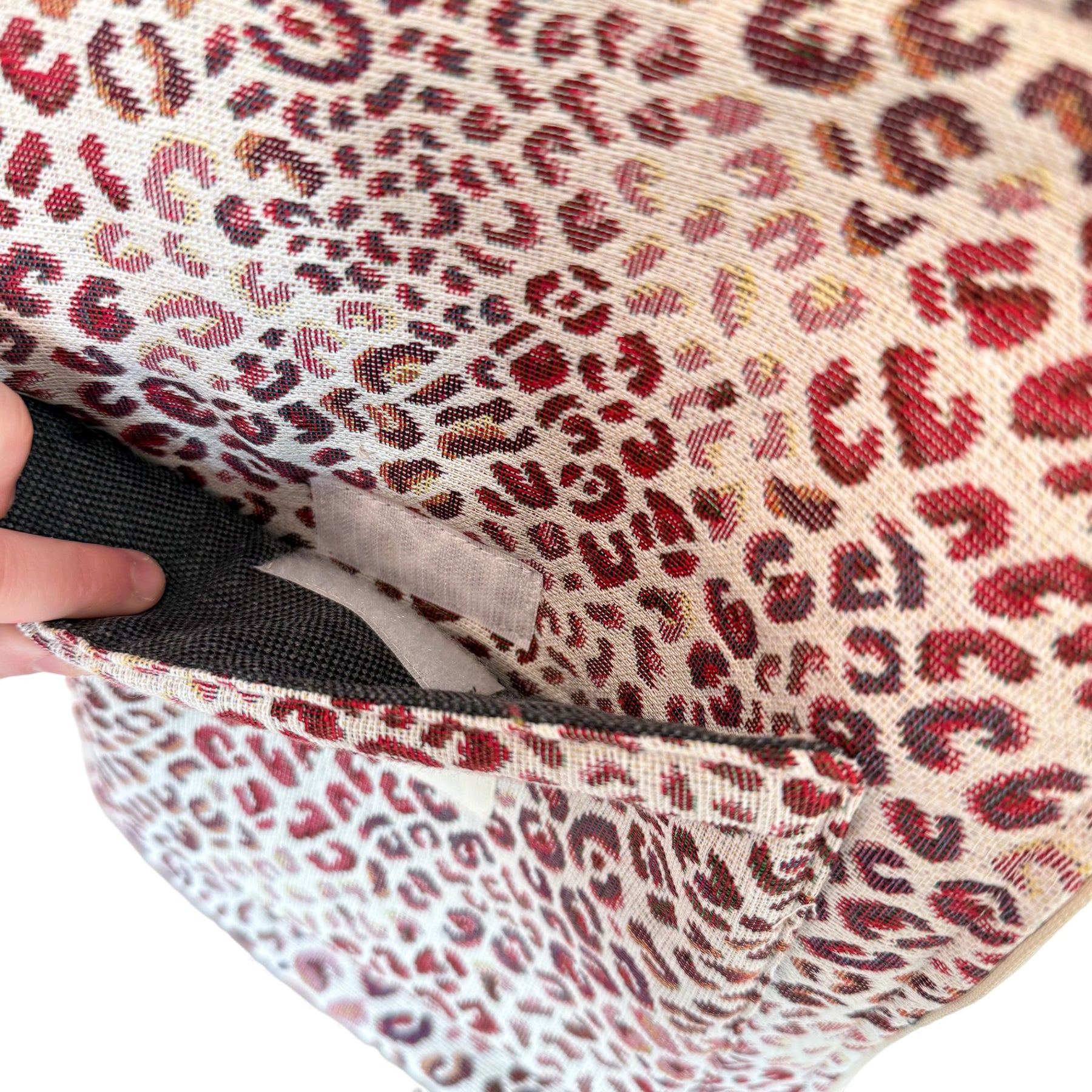 Funda de ordenador portátil con cremallera. Bolsillo exterior con velcro. Con capa interior de espuma para proteger. Con un tejido grueso de jacquard 80% algodón y 20% poliéster con estampado geométrico en tono rosa y lila. Forrado de tejido grueso de color gris en la parte interior. Para su correcto mantenimiento se aconseja lavarlo en frío a mano y no utilizar secadora.