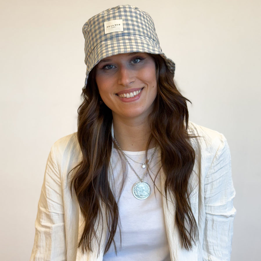 Gorro tipo "Bucket Hat" con tejido fino de half-panama con estampado a cuadros vichy de color azul y forro de tela estampada en la parte interior. Reversible. Talla única. Para su correcto mantenimiento se aconseja lavarlo en frío y no utilizar secadora.