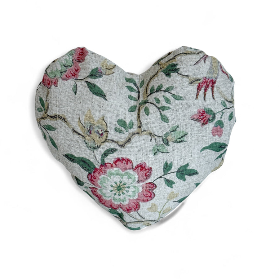 Cojín en forma de corazón con relleno. Con tejido de half-panama con estampado floral en tonos rosados y verdes. Para su correcto mantenimiento se aconseja lavarlo en frío y no utilizar secadora.