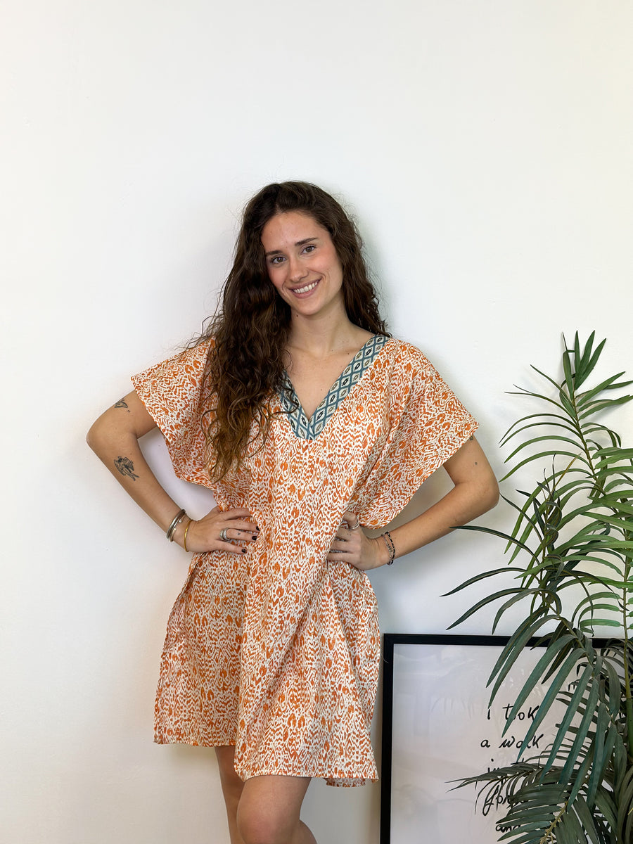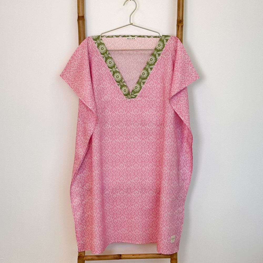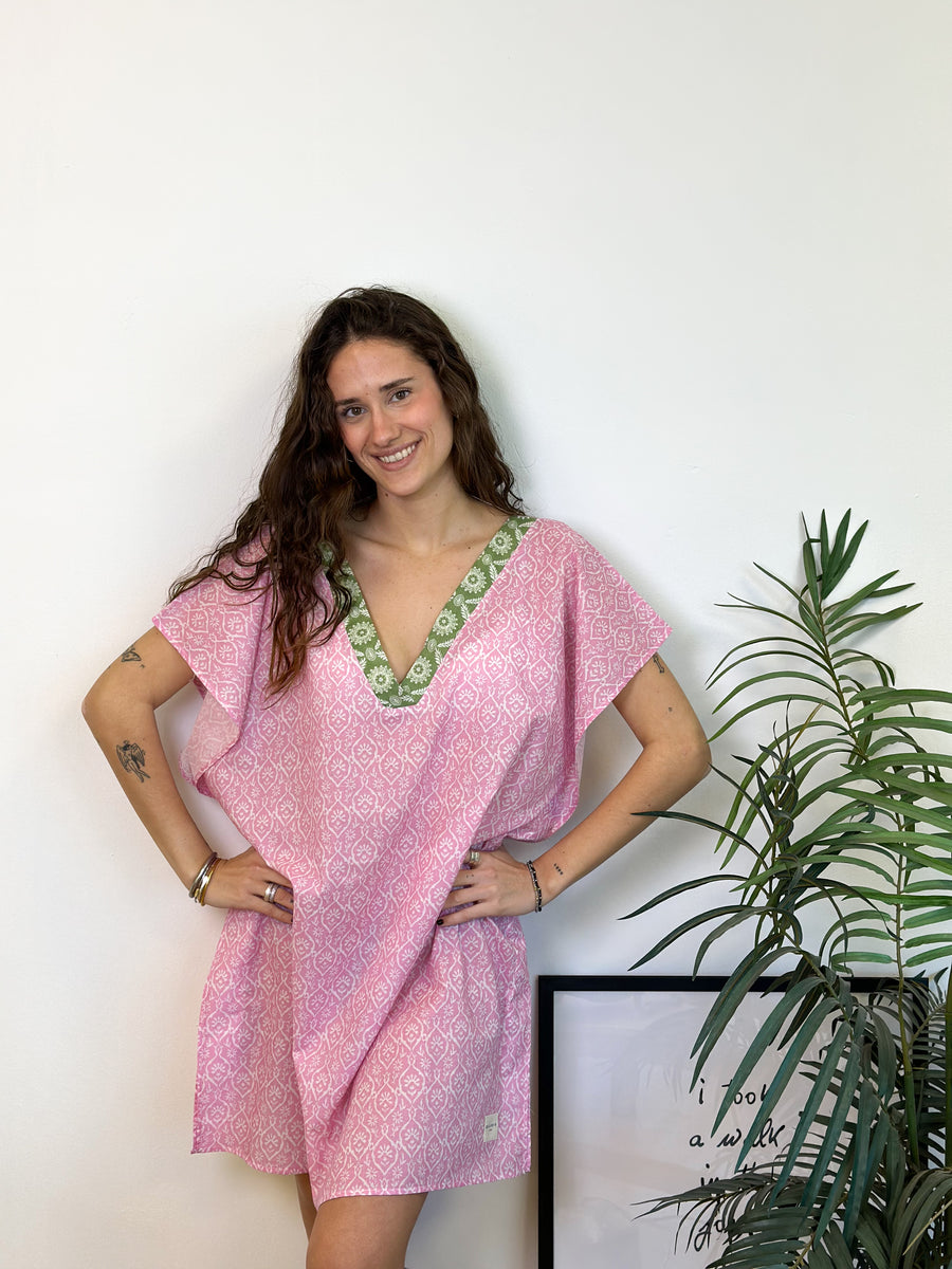 Kaftan de manga corta de tejido fino de voile con estampado geométrico de color verde combinado con escote de pico con estampado floral en color rosa. Talla única. Para su correcto mantenimiento se aconseja lavarlo en frío y no utilizar secadora.