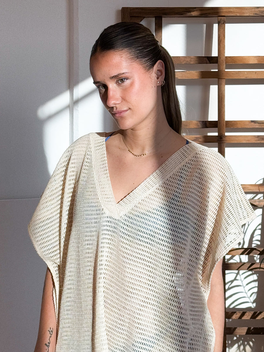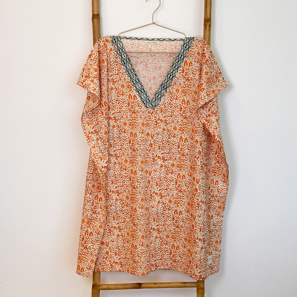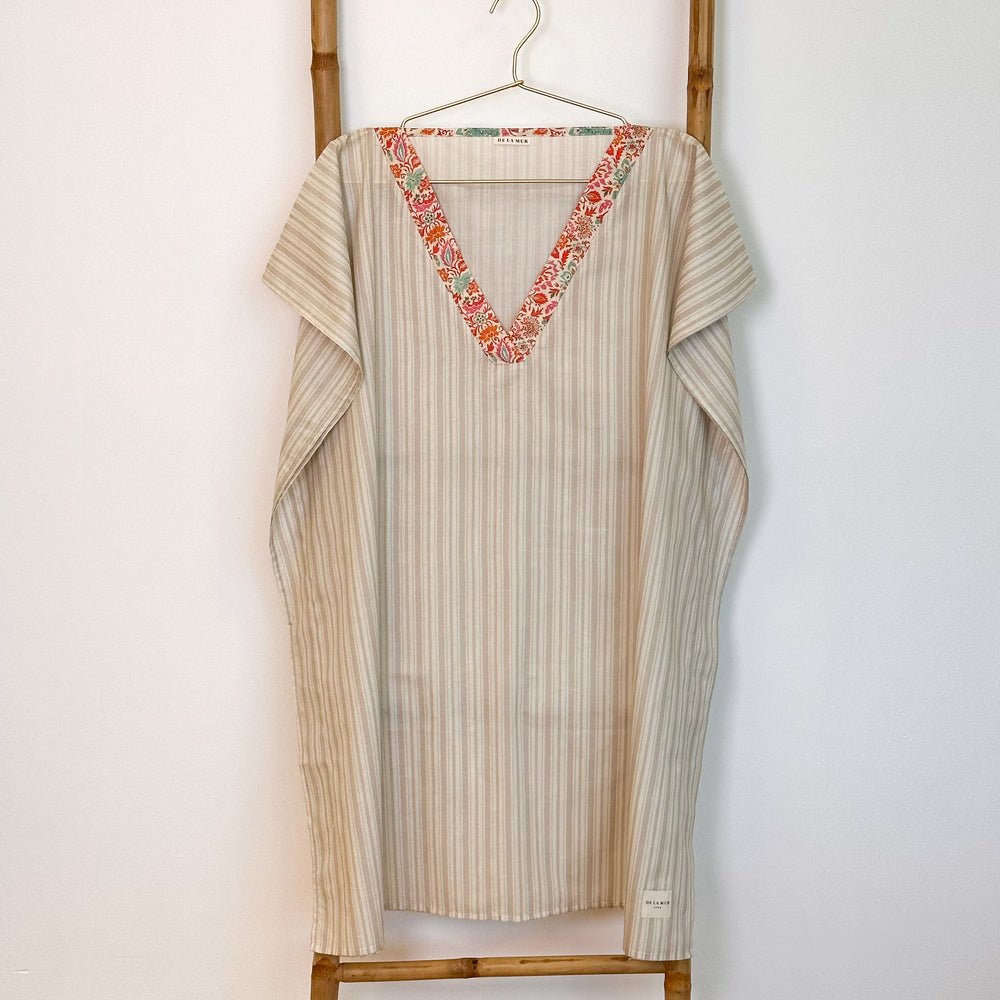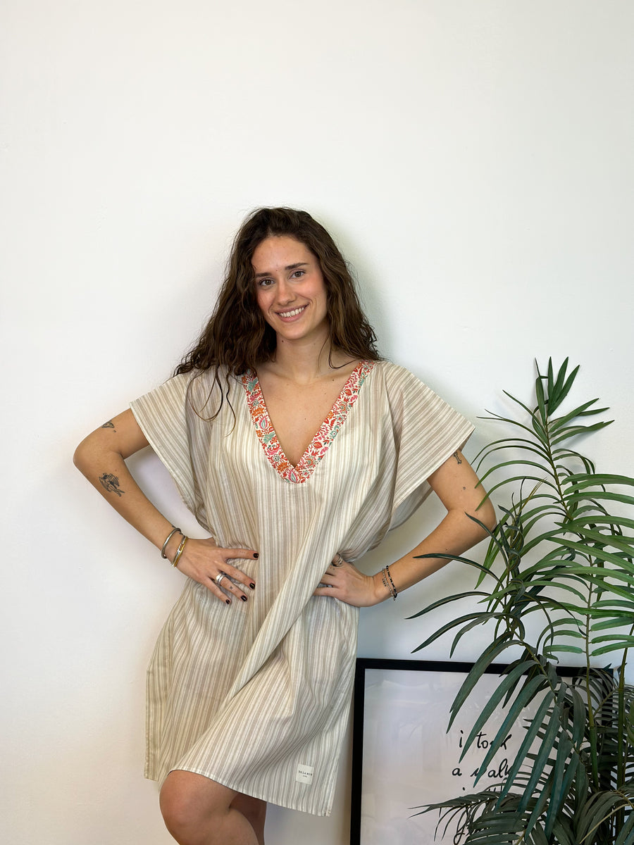 Kaftan de manga corta de tejido fino de voile con estampado geométrico de color verde combinado con escote de pico con estampado floral en color rosa. Talla única. Para su correcto mantenimiento se aconseja lavarlo en frío y no utilizar secadora.