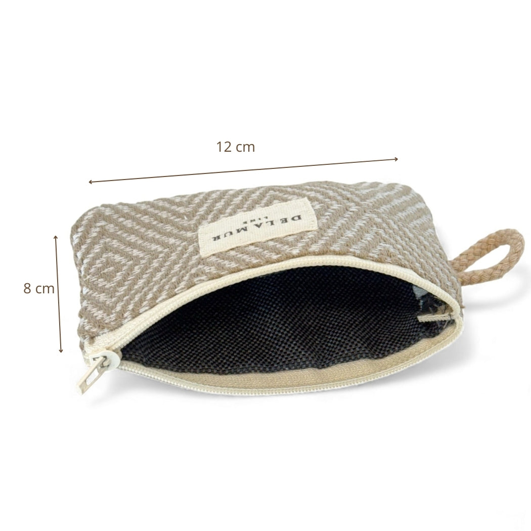 Monedero con cremallera en la parte superior y pequeña asa de cordón de color beige en el lateral. Con tejido grueso de jacquard 80% algodón y 20% poliéster con estampado geométrico en tono beige. Cada articulo puede tener una variación en el estampado, dependiendo de donde se haya efectuado el corte de la pieza. Forrado de tejido grueso de color gris en la parte interior. Para su correcto mantenimiento se aconseja lavarlo en frío y no utilizar secadora.