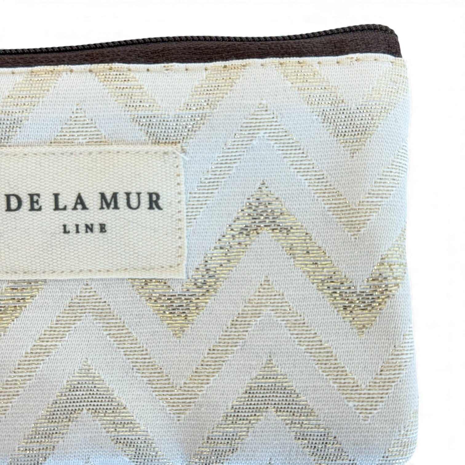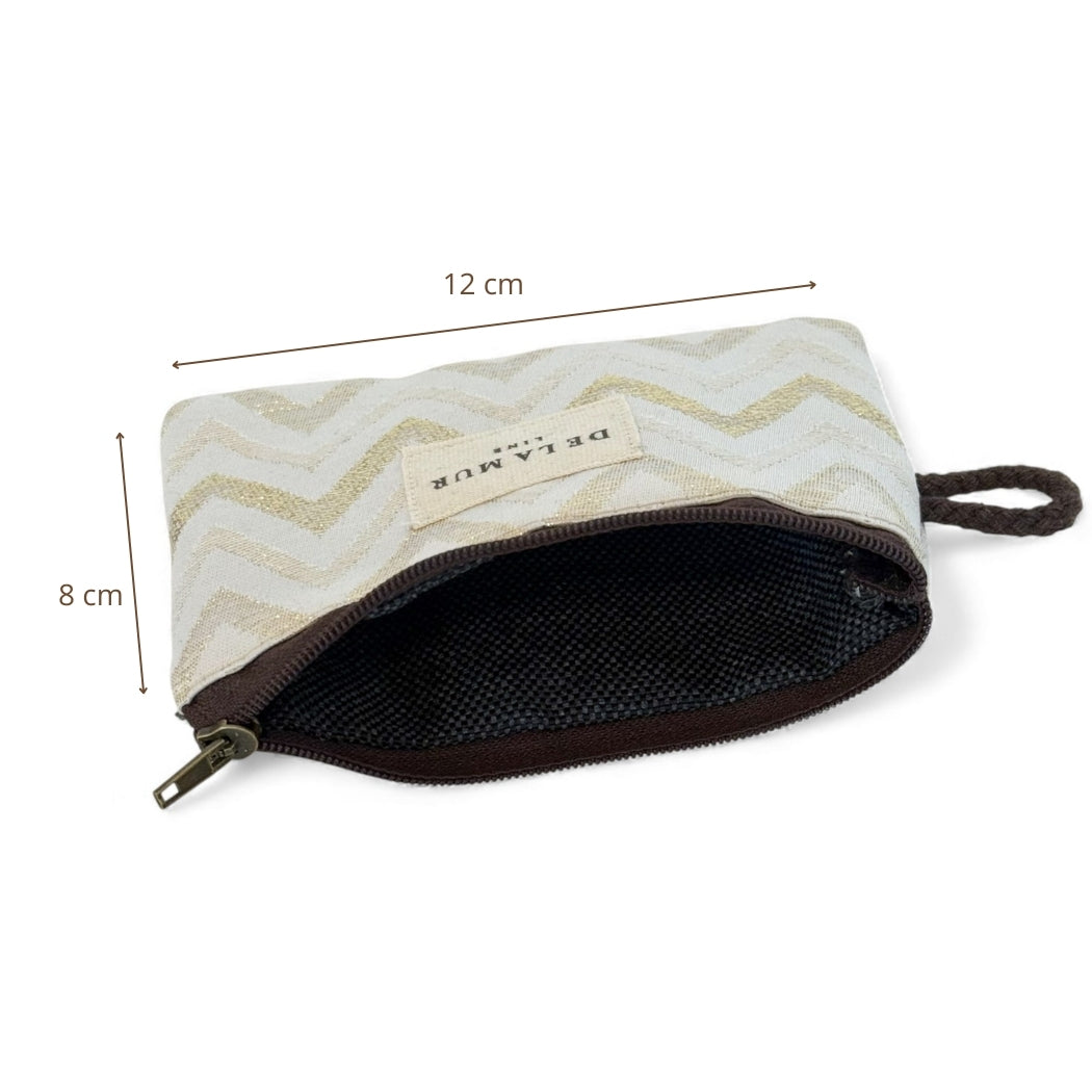 Monedero con cremallera en la parte superior y pequeña asa de cordón de color marrón en el lateral. Con tejido fino de half-panama 80% algodón y 20% poliéster con estampado tipo zigzag de lurex dorado sobre fondo crudo. Cada articulo puede tener una variación en el estampado, dependiendo de donde se haya efectuado el corte de la pieza. Forrado de tejido grueso de color gris en la parte interior. Para su correcto mantenimiento se aconseja lavarlo en frío y no utilizar secadora.