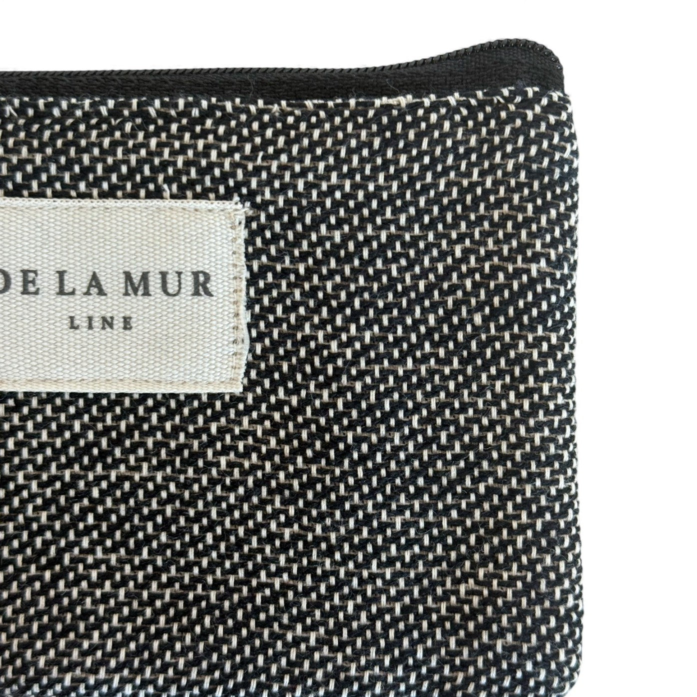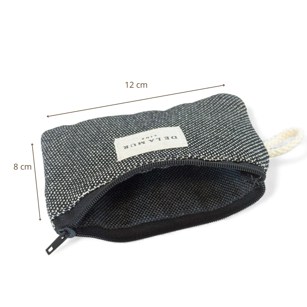 Monedero con cremallera en la parte superior y pequeña asa de cordón de color crudo en el lateral. Con tejido grueso de jacquard 80% algodón y 20% poliéster de color negro/gris oscuro. Cada articulo puede tener una variación en el estampado, dependiendo de donde se haya efectuado el corte de la pieza. Forrado de tejido grueso de color gris en la parte interior. Para su correcto mantenimiento se aconseja lavarlo en frío y no utilizar secadora.