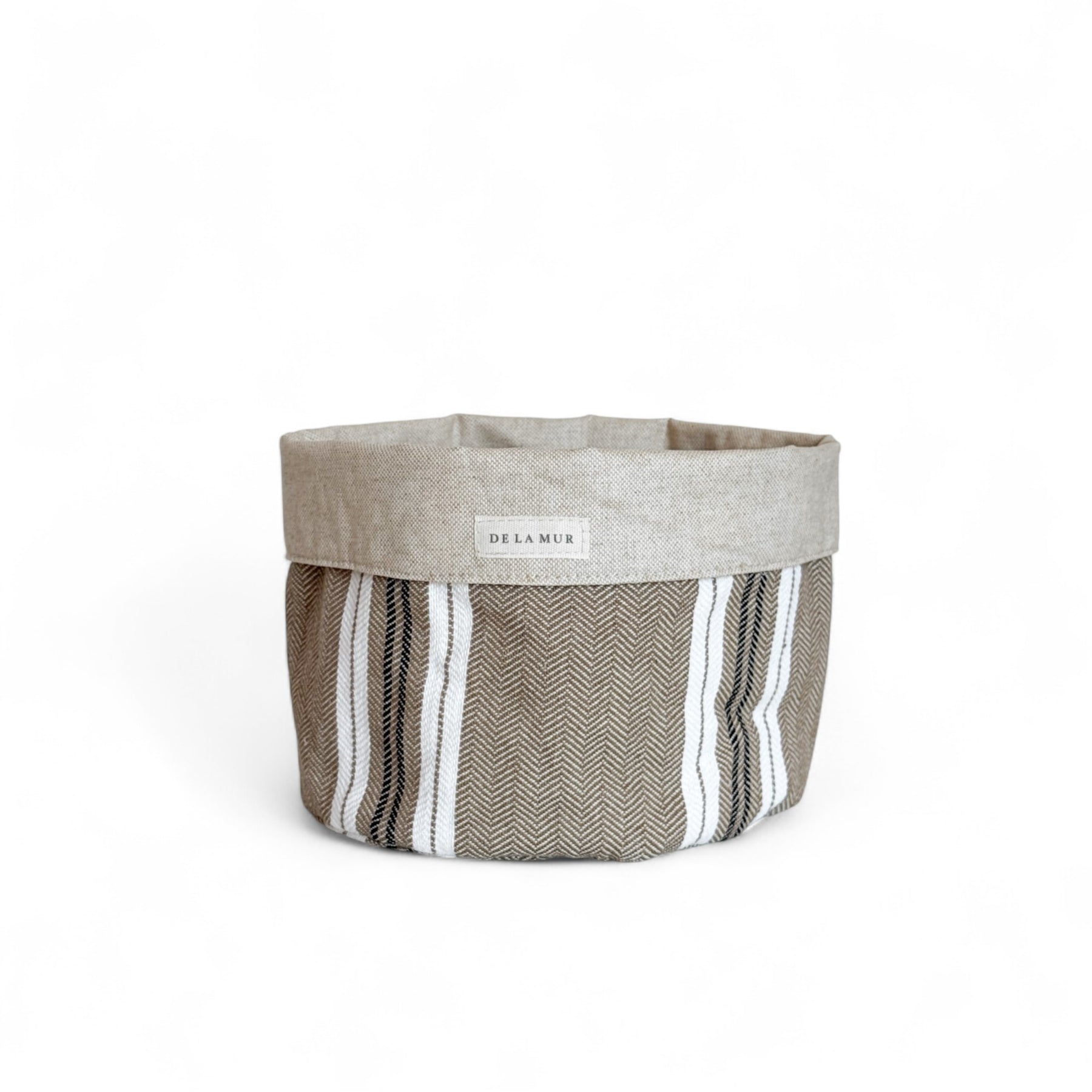 Cesta mediana multiusos. Con tejido grueso con estampado a rayas de color marrón clarito y blanco en el exterior, y tejido resinado en el interior. Para su correcto mantenimiento se aconseja lavarlo en frío y no utilizar la secadora.