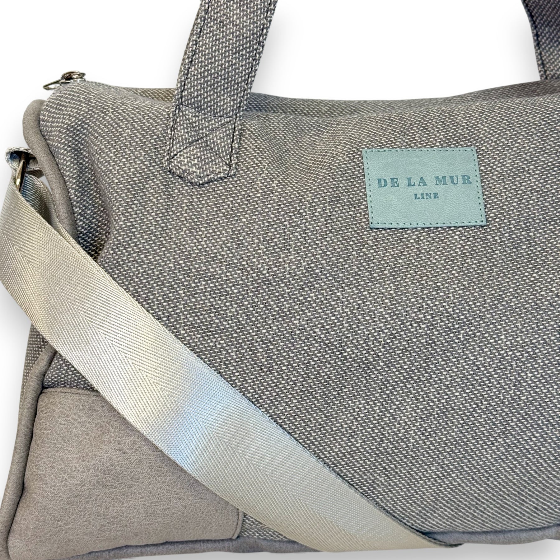 Bolso mediano edición limitada con asa larga ajustable de nylon brillante en tono gris y doble asa para colgar en el hombro de tejido. Combinado con dos tejidos, uno de jacquard 80% algodón y 20% poliéster de color liso gris y otro con efecto polipiel de color gris en los laterales. Opción de llevarlo al hombro o como bandolera. Bolsillo interior con cremallera. Etiqueta de marca de polipiel azul turquesa. Para su correcto mantenimiento se aconseja lavarlo en frío a mano y no utilizar secadora.