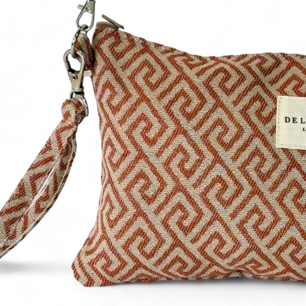 Bolso tipo "Clutch" con asa de cadena de color plata y con asa pequeña en el lateral extraíble para llevar en la muñeca. Con tejido grueso de jacquard con estampado de color teja. Con forro interior y cremallera en la parte superior. Para su correcto mantenimiento se aconseja lavarlo en frío y no utilizar secadora.