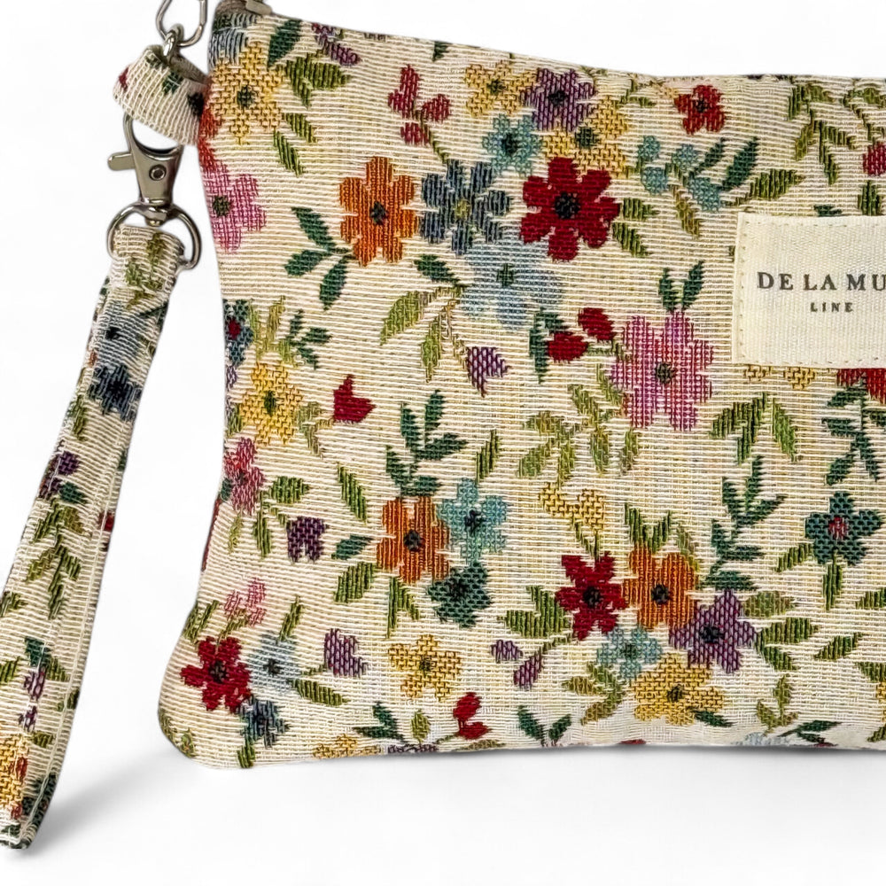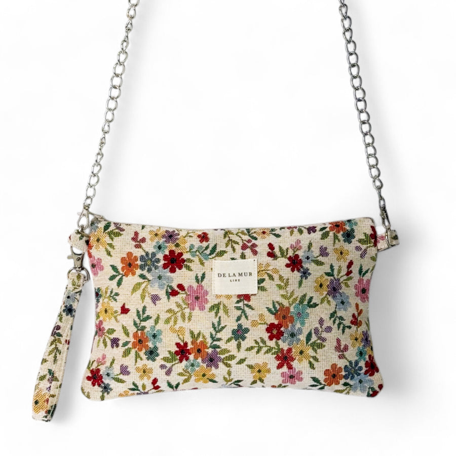Bolso tipo "Clutch" con asa de cadena de color plata y con asa pequeña en el lateral extraíble para llevar en la muñeca. Con tejido grueso de jacquard con estampado floral sobre fondo beige. Con forro interior y cremallera en la parte superior. Para su correcto mantenimiento se aconseja lavarlo en frío y no utilizar secadora.