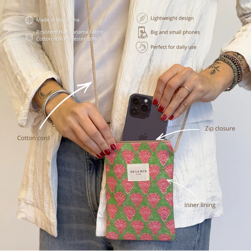 Bolsito porta móvil para llevar tipo bandolera. Con cremallera en la parte superior y cordón largo de algodón de color beige. Con tejido fino de half-panama con estampado floral en tonos rosa y verde. Cada articulo puede tener una variación en el estampado, dependiendo de donde se haya efectuado el corte de la pieza. Forrado de tejido grueso de color gris en la parte interior. Para su correcto mantenimiento se aconseja lavarlo en frío a mano y no utilizar secadora.