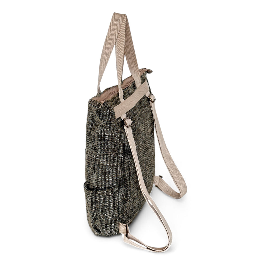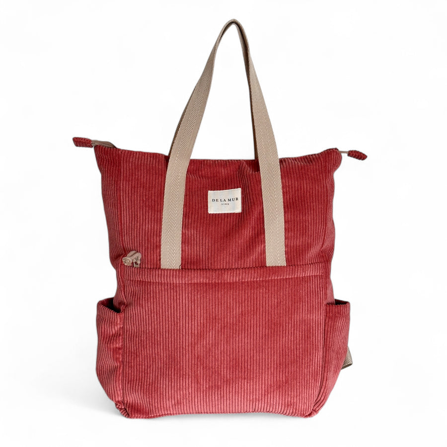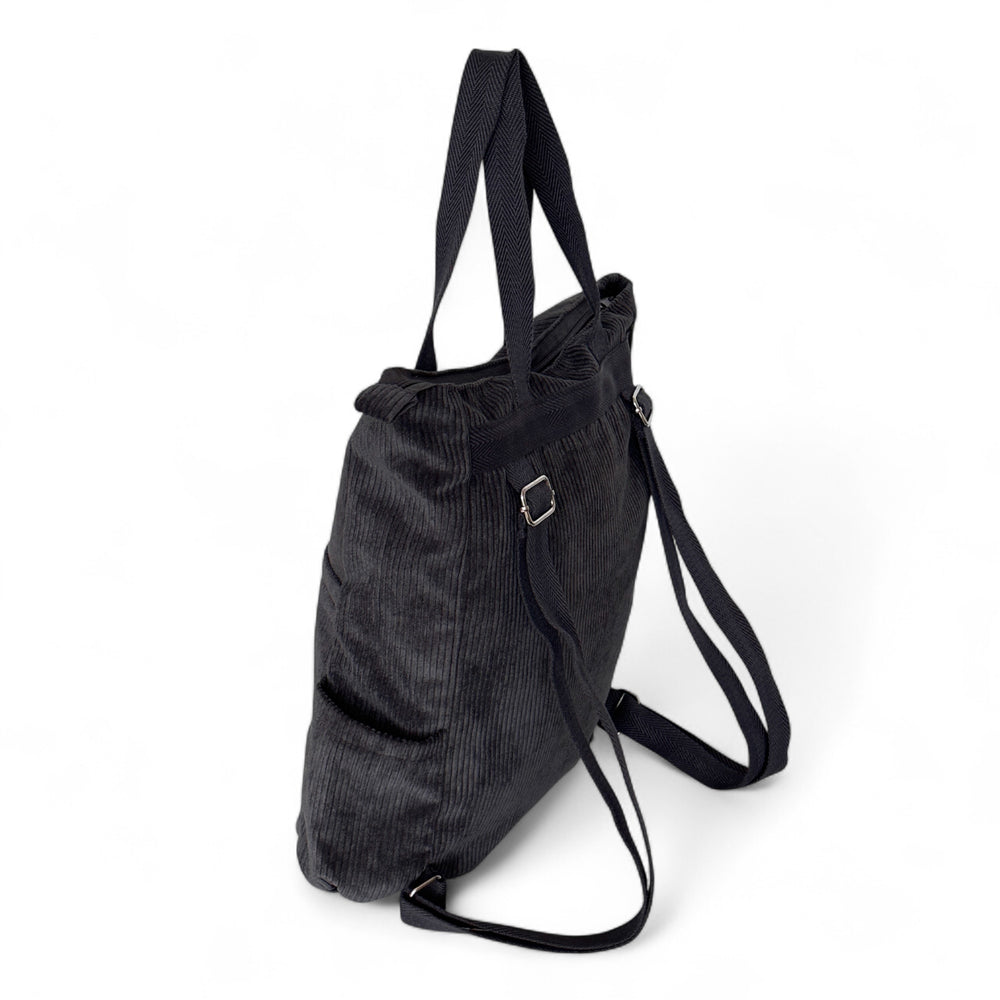 Mochila con asas ajustables y dos asas en la parte central para llevar al hombro tipo bolso. Con tejido grueso tapicero de pana de color gris oscuro. Bolsillo interior con cremallera. Asas de cinta de espiga de algodón de color gris oscuro. Para su correcto mantenimiento se aconseja lavarlo en frío y no utilizar secadora.