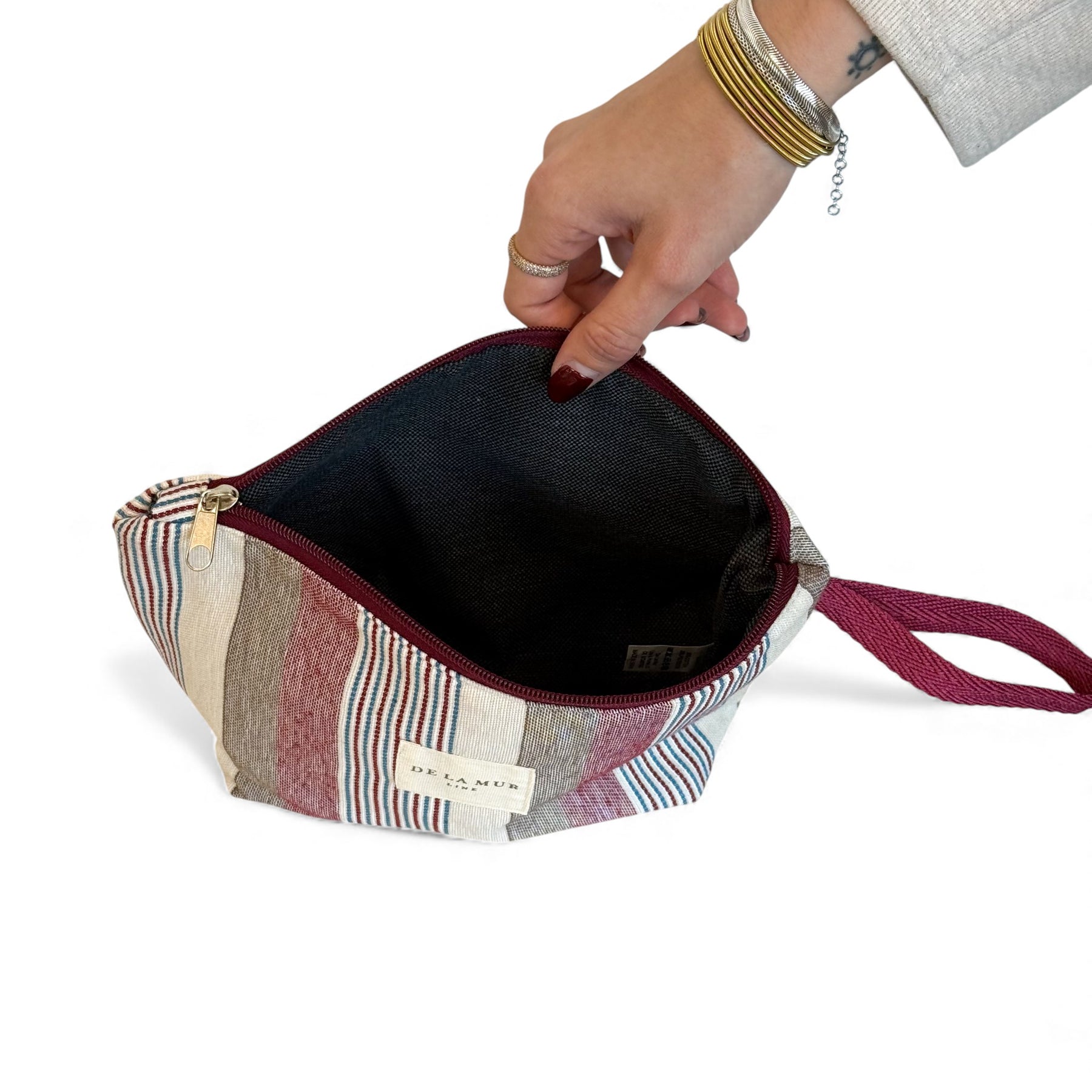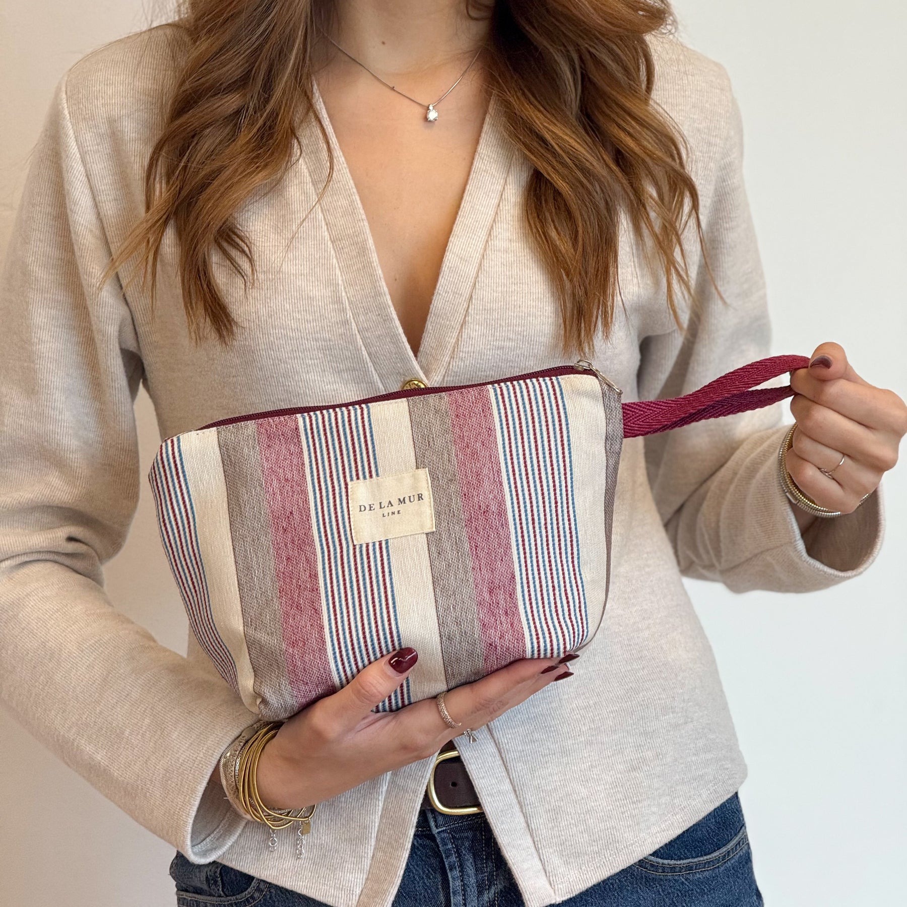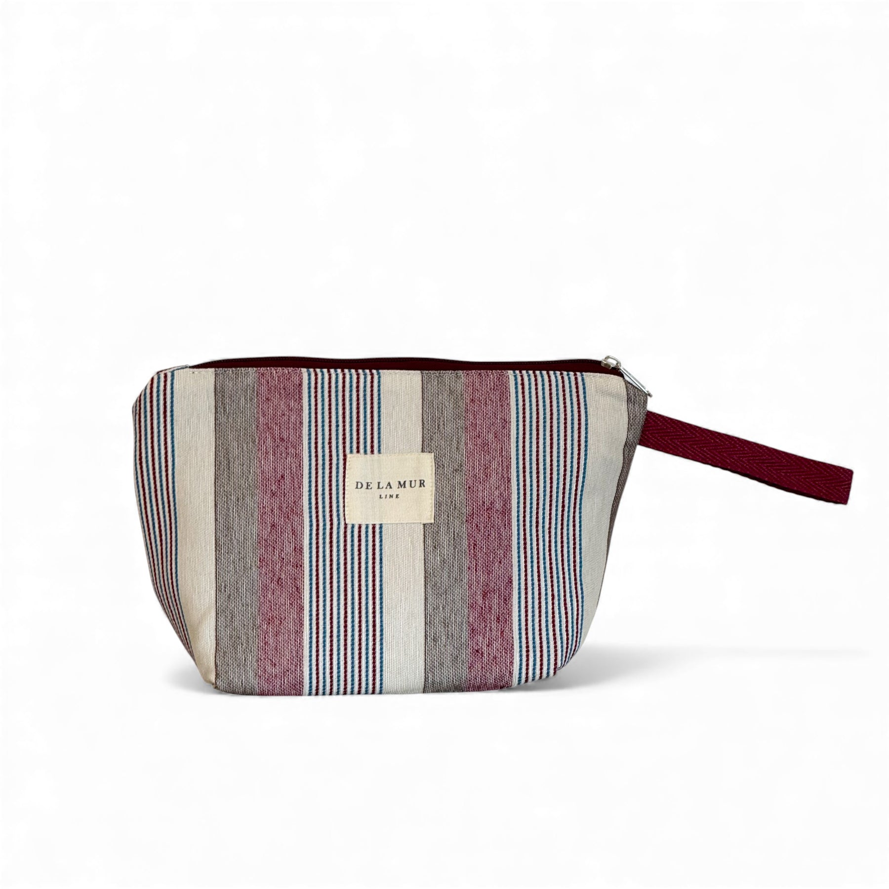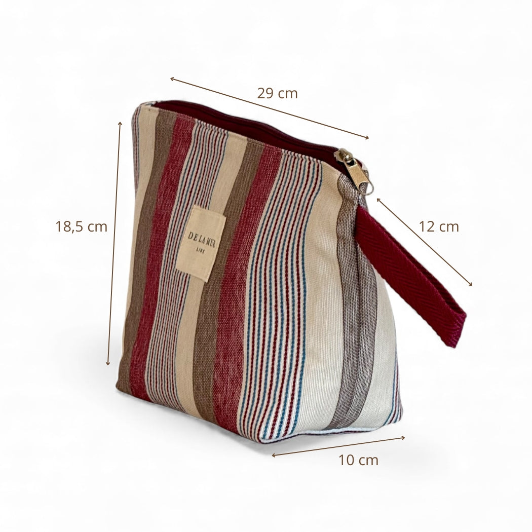 Neceser con cremallera en la parte superior y asa de cordón de color granate en el lateral. Con tejido grueso de jacquard 80% algodón y 20% poliéster con estampado a rayas en tonos granate, azul y crudo. Forrado de tejido grueso de color gris en la parte interior. Para su correcto mantenimiento se aconseja lavarlo en frío y no utilizar secadora.