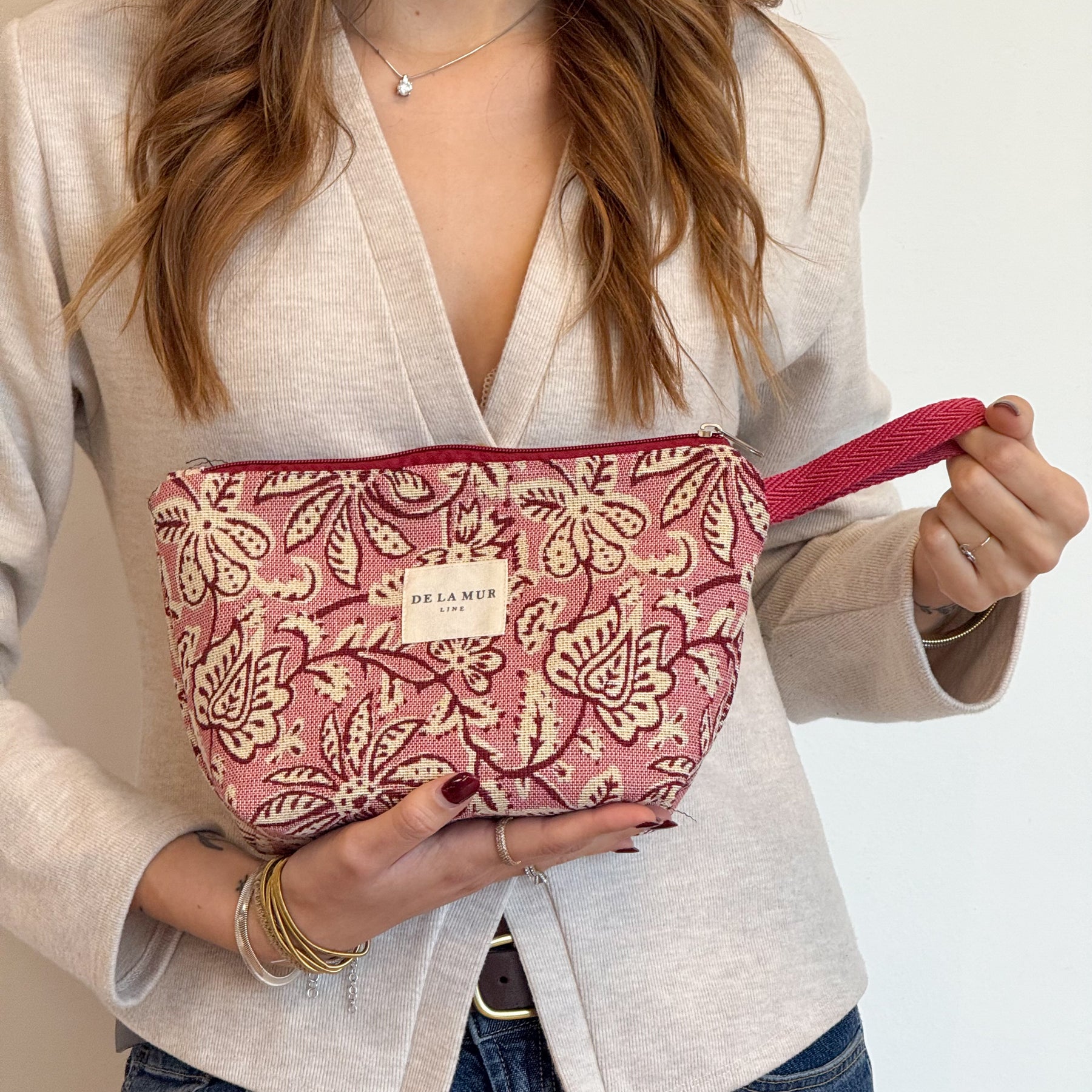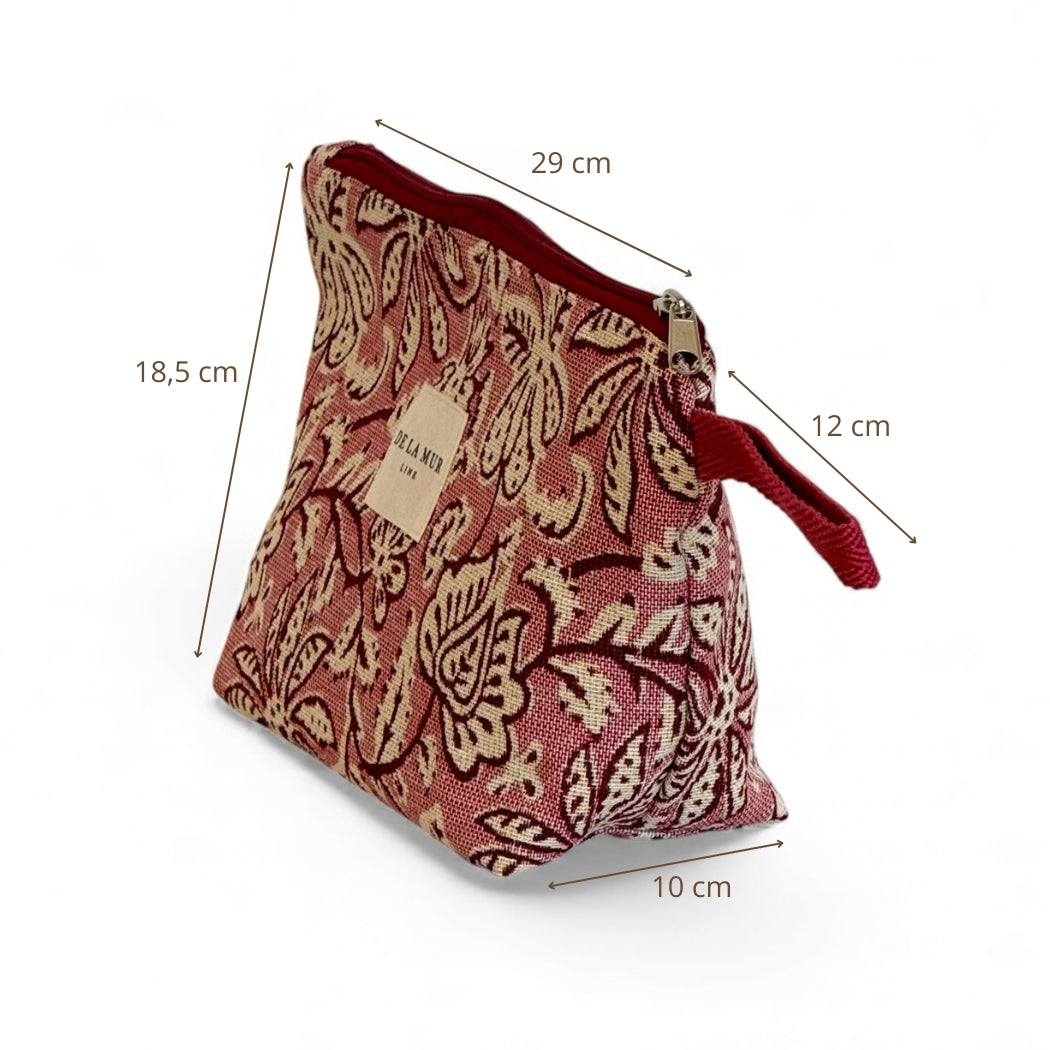 Neceser con cremallera en la parte superior y asa de cordón de color granate en el lateral. Con tejido grueso de jacquard 80% algodón y 20% poliéster con estampado floral en tono crudo sobre fondo rosado. Forrado de tejido grueso de color gris en la parte interior. Para su correcto mantenimiento se aconseja lavarlo en frío y no utilizar secadora.