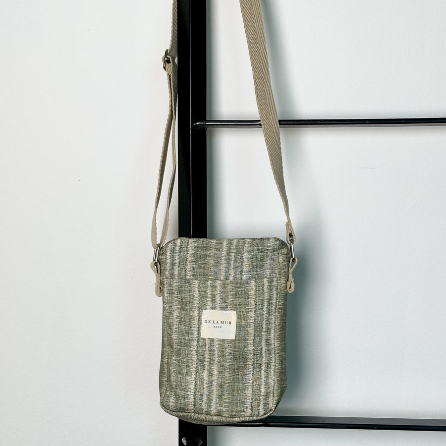 Bolso porta móvil para llevar tipo bandolera, con cremallera en la parte superior y asa larga ajustable de cinta de espiga de algodón de color beige. Bolsillo sin cremallera en la parte exterior. Con tejido fino liso de color azul marino. Forrado de tejido grueso de color gris en la parte interior. Para su correcto mantenimiento se aconseja lavarlo en frío a mano y no utilizar secadora.