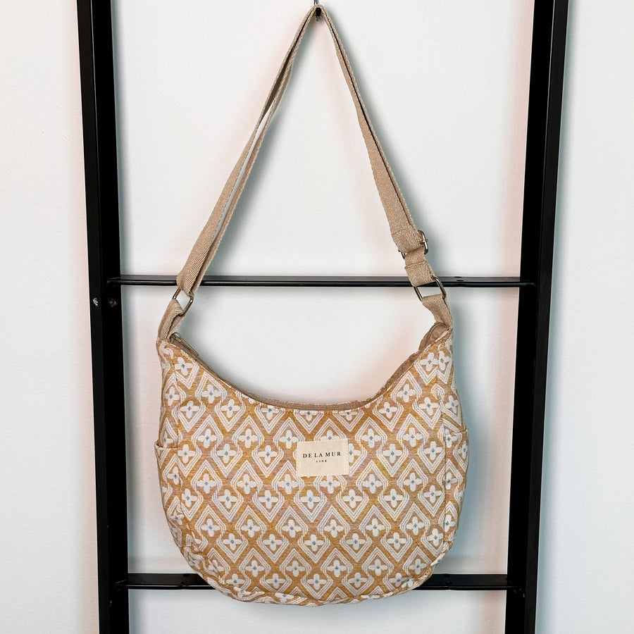 Bolso luna tipo bandolera con asa larga ajustable de cinta de espiga de algodón de color beige. Cierre superior con cremallera. Bolsillos laterales sin cremallera. Con tejido con estampado geométrico de color mostaza. Forrado de tejido grueso de color gris en la parte interior. Bolsillo interior con cremallera. Para su correcto mantenimiento se aconseja lavarlo en frío a mano y no utilizar secadora.